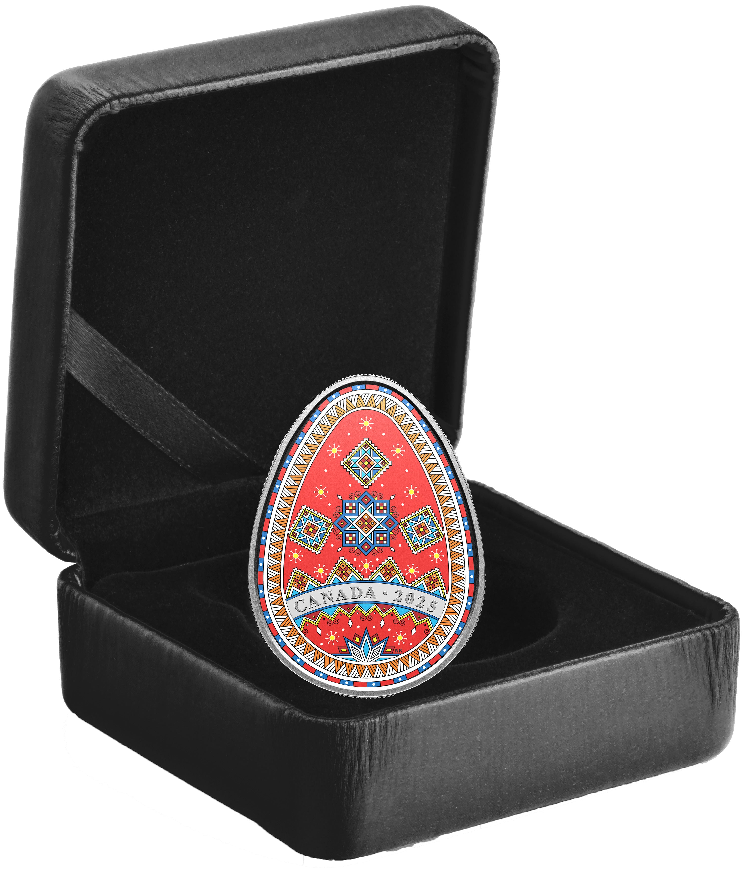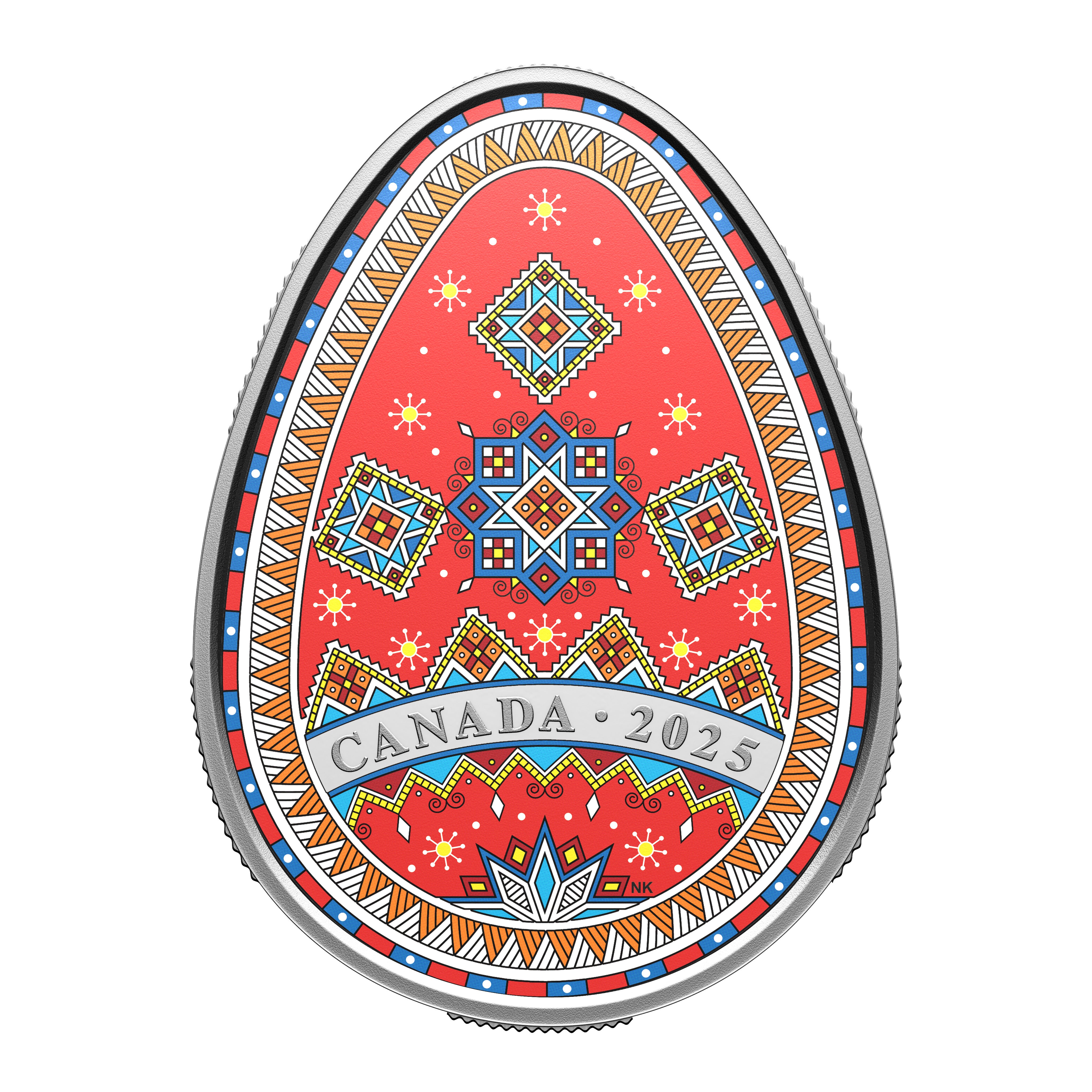 The Design: Crafted in 1 oz. of 99.99% fine silver, this 2025 fine silver pysanka features one of the most challenging pysanky designs so far, with intricate patterns and multiple colours that all carry symbolic weight. Features several traditional Ukrainian cosmomorphic motifs— ancient symbols for the sun, the stars, and what they represent. The design incorporates glimpses of the coin’s silver surface, weaving sparkling precious metal with vivid colours.
