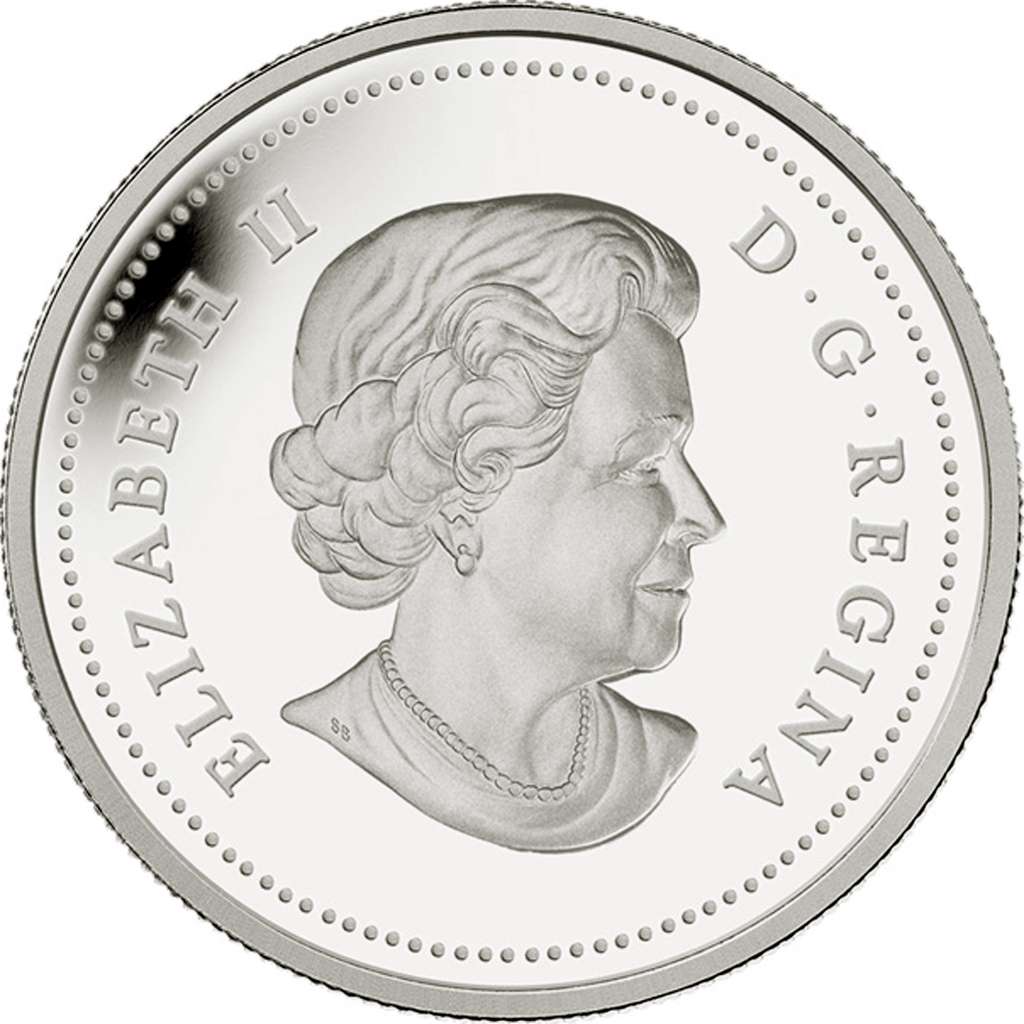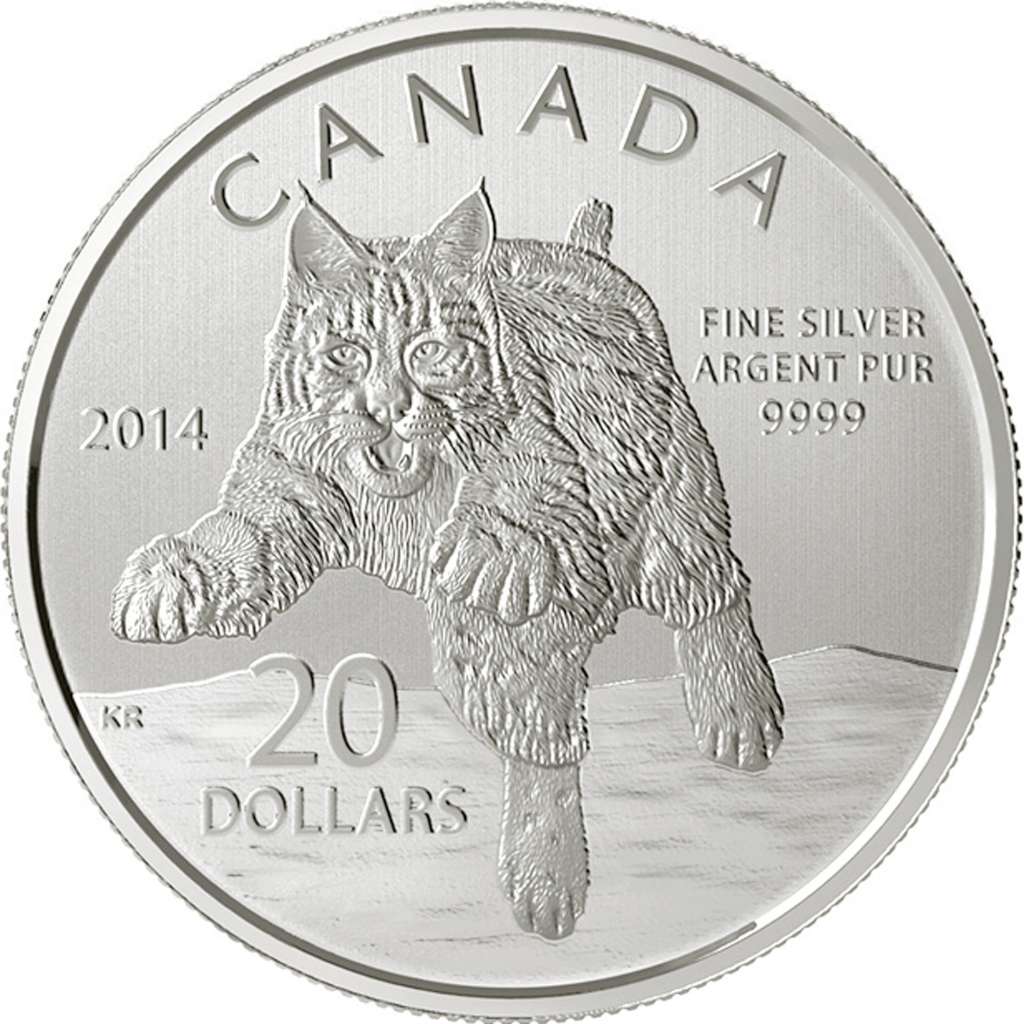 The reverse design of this fine silver coin features an original full-body portrait of a bobcat by Canadian artist Ken Ryan. The relatively abundant yet rarely-seen feline is portrayed mid-leap as it pounces upon its unsuspecting prey. Viewed from the front, face and outstretched forepaws pointed directly at the viewer, the bobcat is presented in stunning detail. Its characteristic black-tufted ears point backward as its black-lined eyes, small black nose and sharp-toothed mouth snarl in focused intensity. Its large front paws and fur-lined forelegs are outstretched before it, while its long and powerful back legs drive the animal forward. The stubbed, black-ringed tail from which the bobcat draws its name is visible above the animal's striped and spotted back. Each hair and whisker is carefully detailed and shaded using multiple finishes, highlighting the world-class artistry of Royal Canadian Mint engravers.