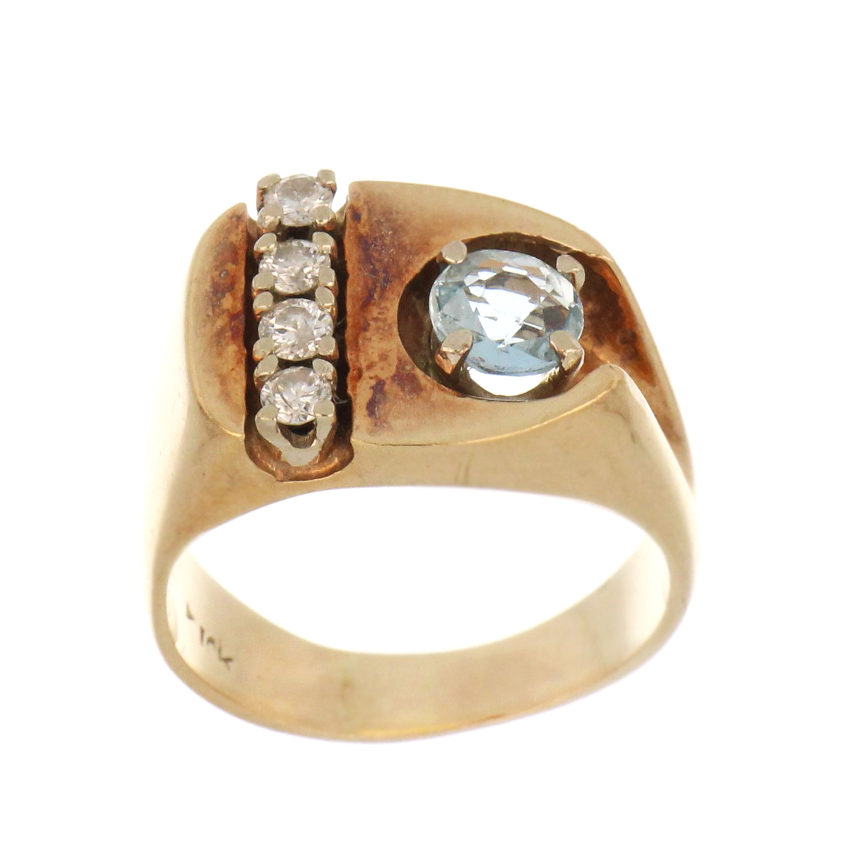 This pre-owned 10kt yellow gold dinner ring showcases a beautifully luminous round aquamarine accented by four sparkling diamonds for an elegant, vintage-inspired look.