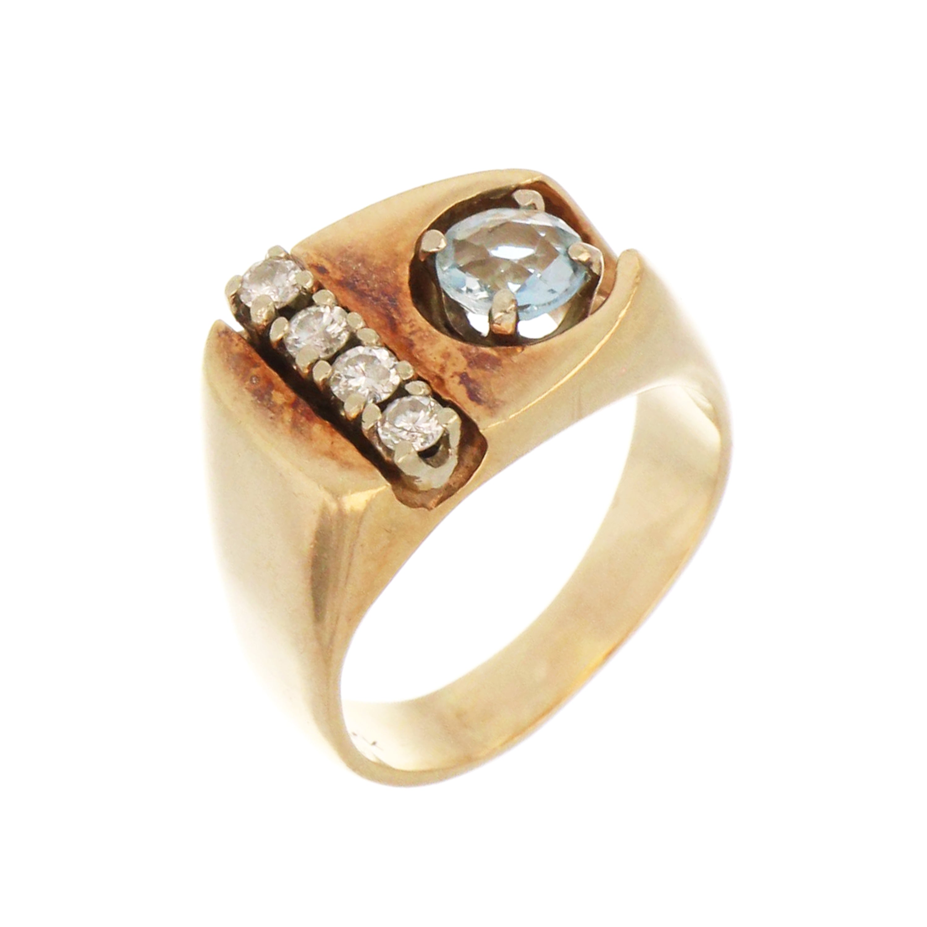 Crafted in warm 10kt yellow gold, this striking pre-owned dinner ring features a captivating round aquamarine measuring approximately 5.3 mm. The gemstone displays the serene, icy-blue tone aquamarine is prized for, offering a refreshing yet refined centrepiece. Surrounding the aquamarine are four full-cut round diamonds with an estimated combined weight of 0.16 cttw. Graded approximately SI2–I1 in clarity and H–I in colour, these diamonds add soft sparkle and contrast that highlights the cool brilliance of the aquamarine.