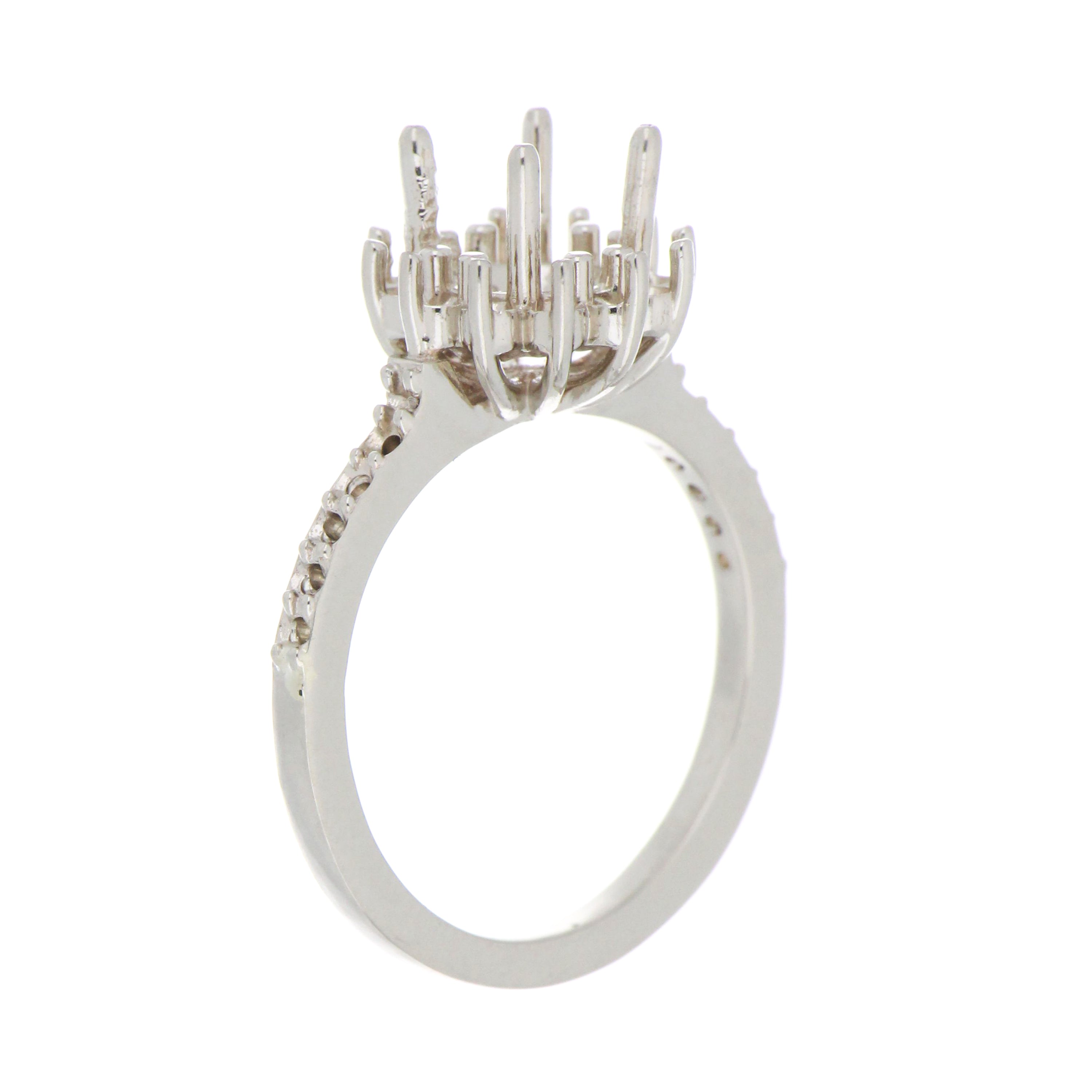 14kt white gold halo style ring mounting, center round shaped stone estimated fits to 6.0mm, surrounded with 12 pieces of round shaped stones estimated fit 2.0-2.2mm for each, and 12 pieces of round shaped stone estimated fit 1.8mm for each on both sides of shoulder in 4-claw setting with highly polished shank. The total weight is 4.86 grams. Ring size 7.5.