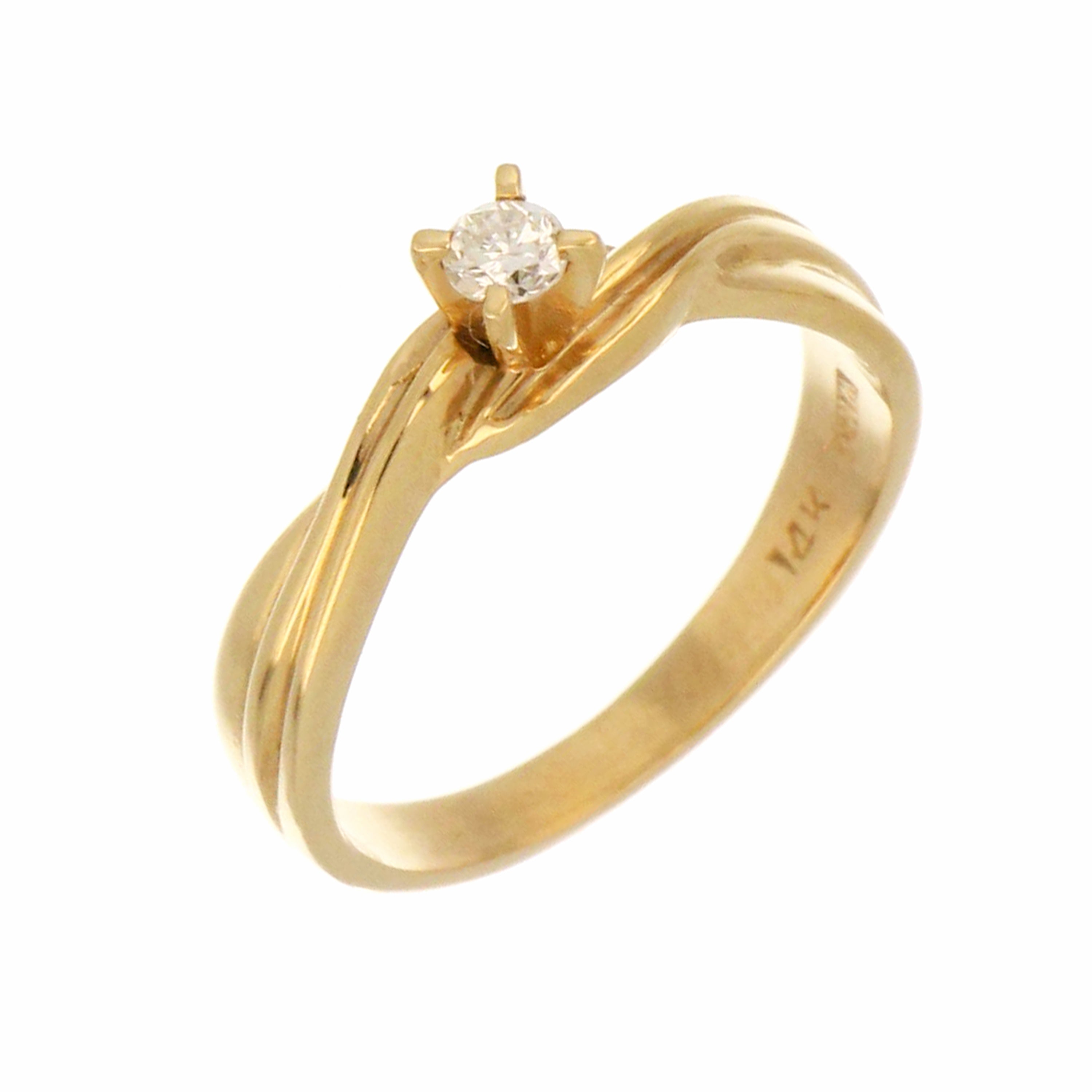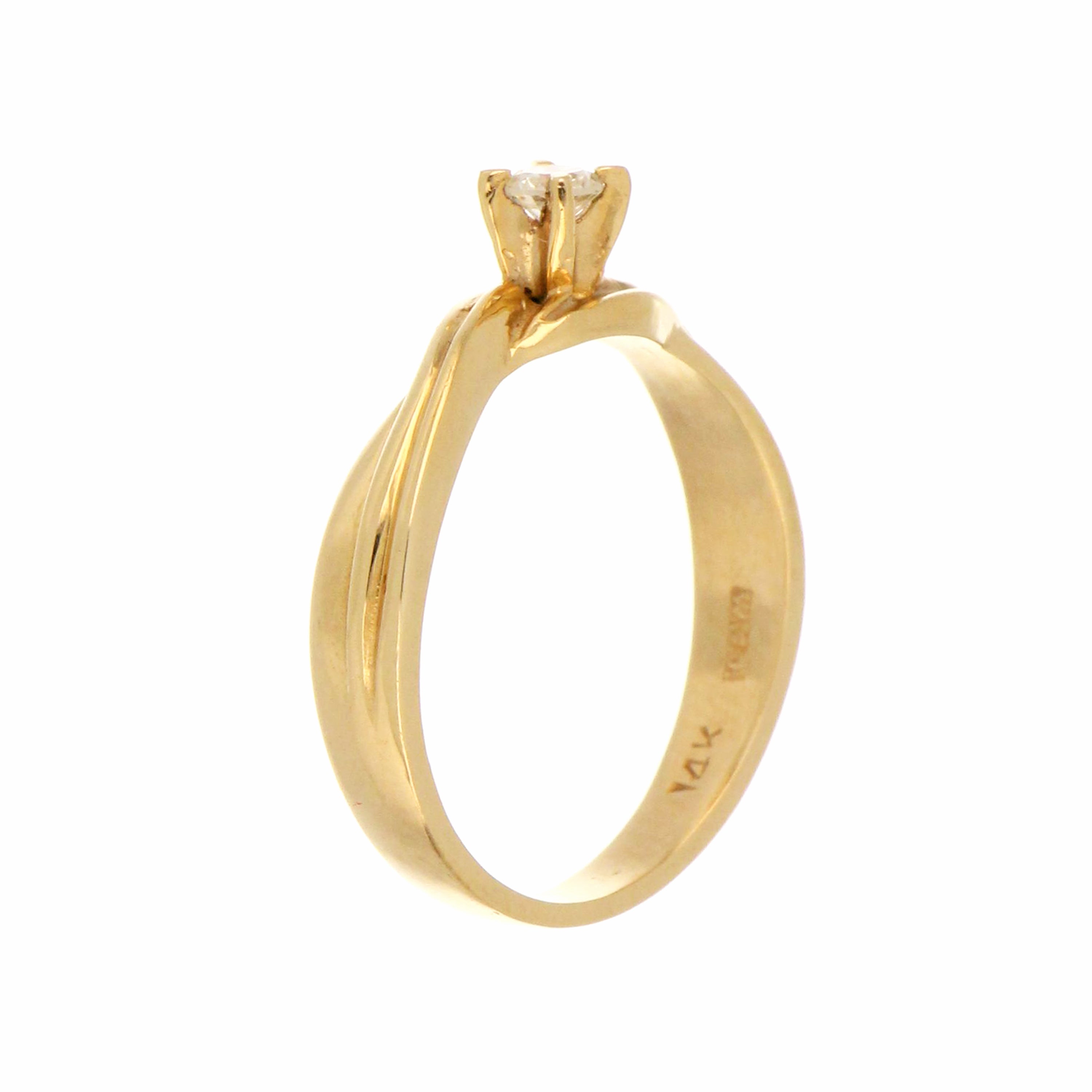 14kt yellow gold diamond ring, the round brilliant cut diamond estimated weight 0.09ct, in VS2 clarity and H color, set in 4-claw setting. The total weight of this ring is 2.62 grams. Ring size 5.