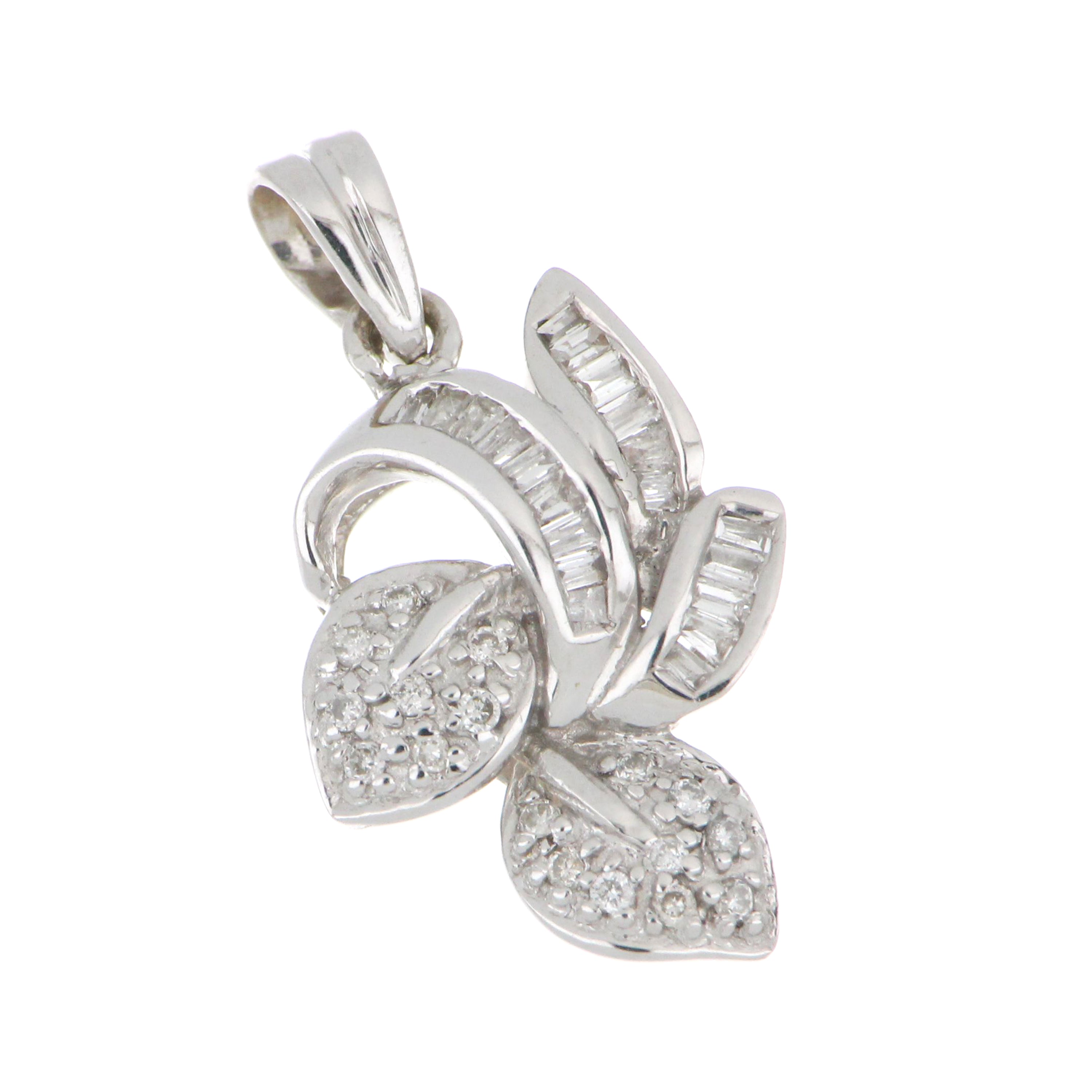 18kt white gold diamond pendant, round shaped full cut diamonds and baguette cut diamonds estimated weight 0.35cttw, SI/H-I, 1.92 grams. (Pre-owned Sold As Is)