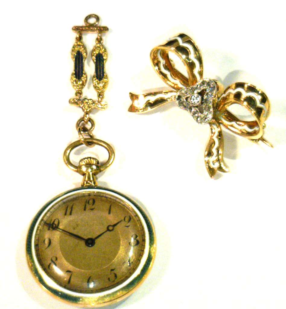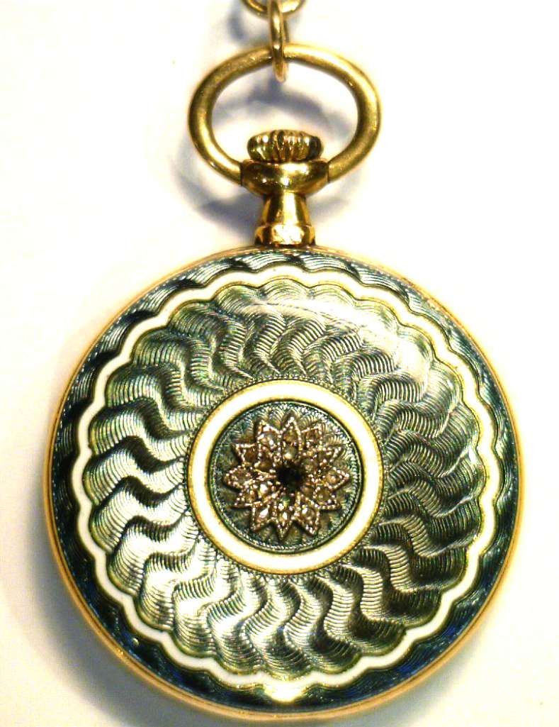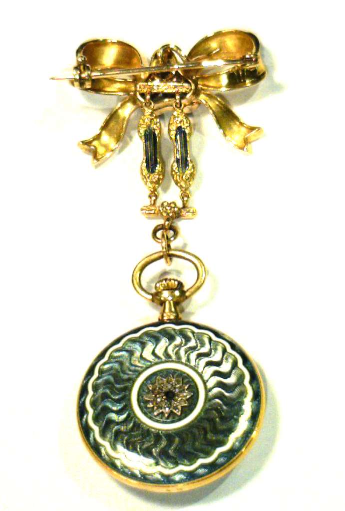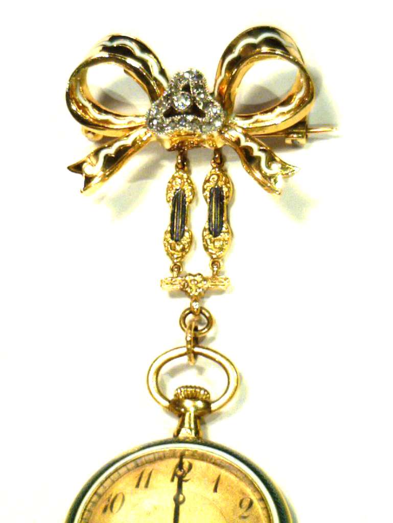 Ladies' 18kt yellow gold antique pocket watch, original 18kt yellow gold case with blue, white and grey color enamel and rose cut diamonds, manual wind movement, inside back case: 10629; hangs on a removable piece of 18kt yellow gold bow with white and grey color enamel and rose cut diamonds, circa 1900's. The total weight of this pocket watch and bow is 25.65 grams.
