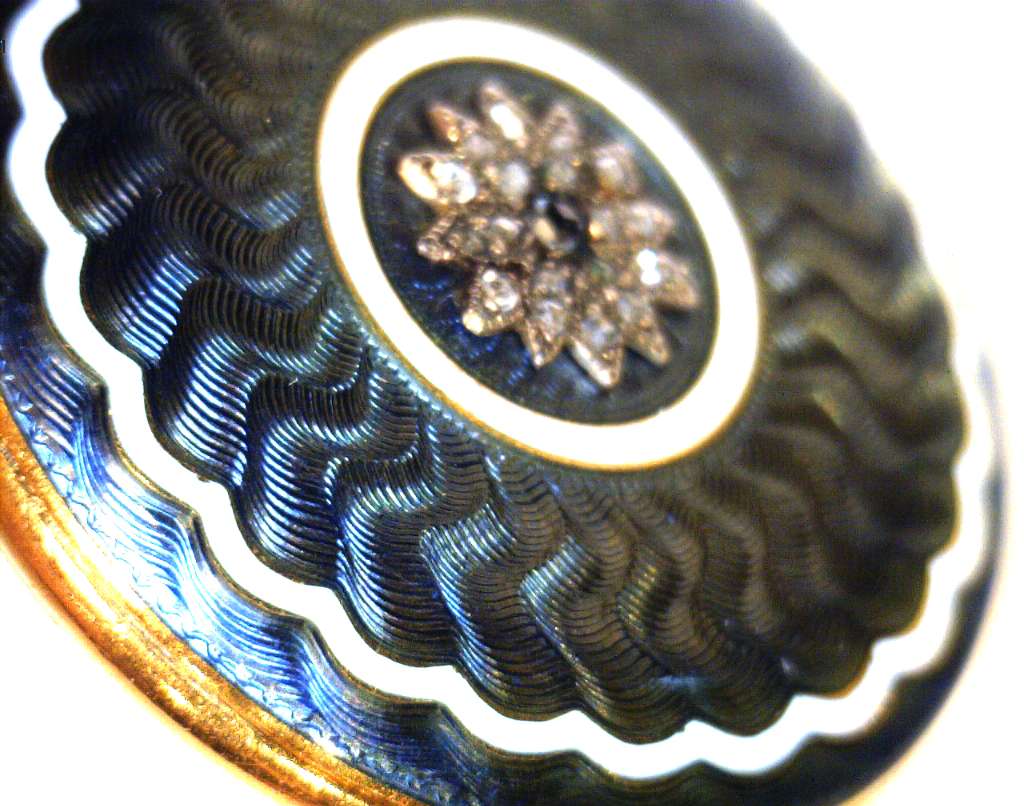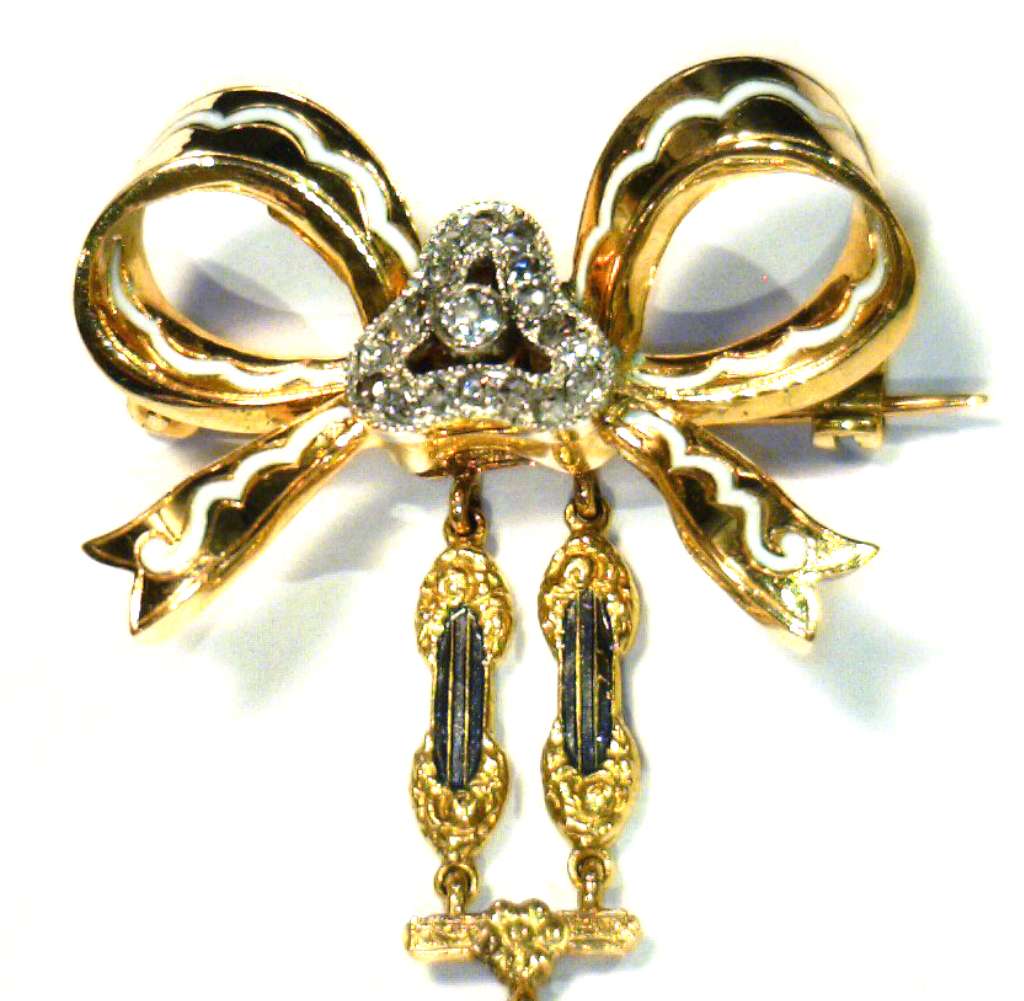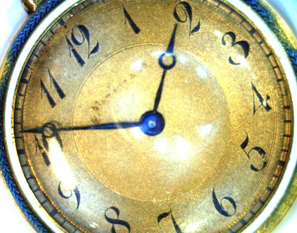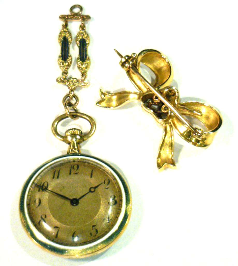 Ladies' 18kt yellow gold antique pocket watch, original 18kt yellow gold case with blue, white and grey color enamel and rose cut diamonds, manual wind movement, inside back case: 10629; hangs on a removable piece of 18kt yellow gold bow with white and grey color enamel and rose cut diamonds, circa 1900's. The total weight of this pocket watch and bow is 25.65 grams.