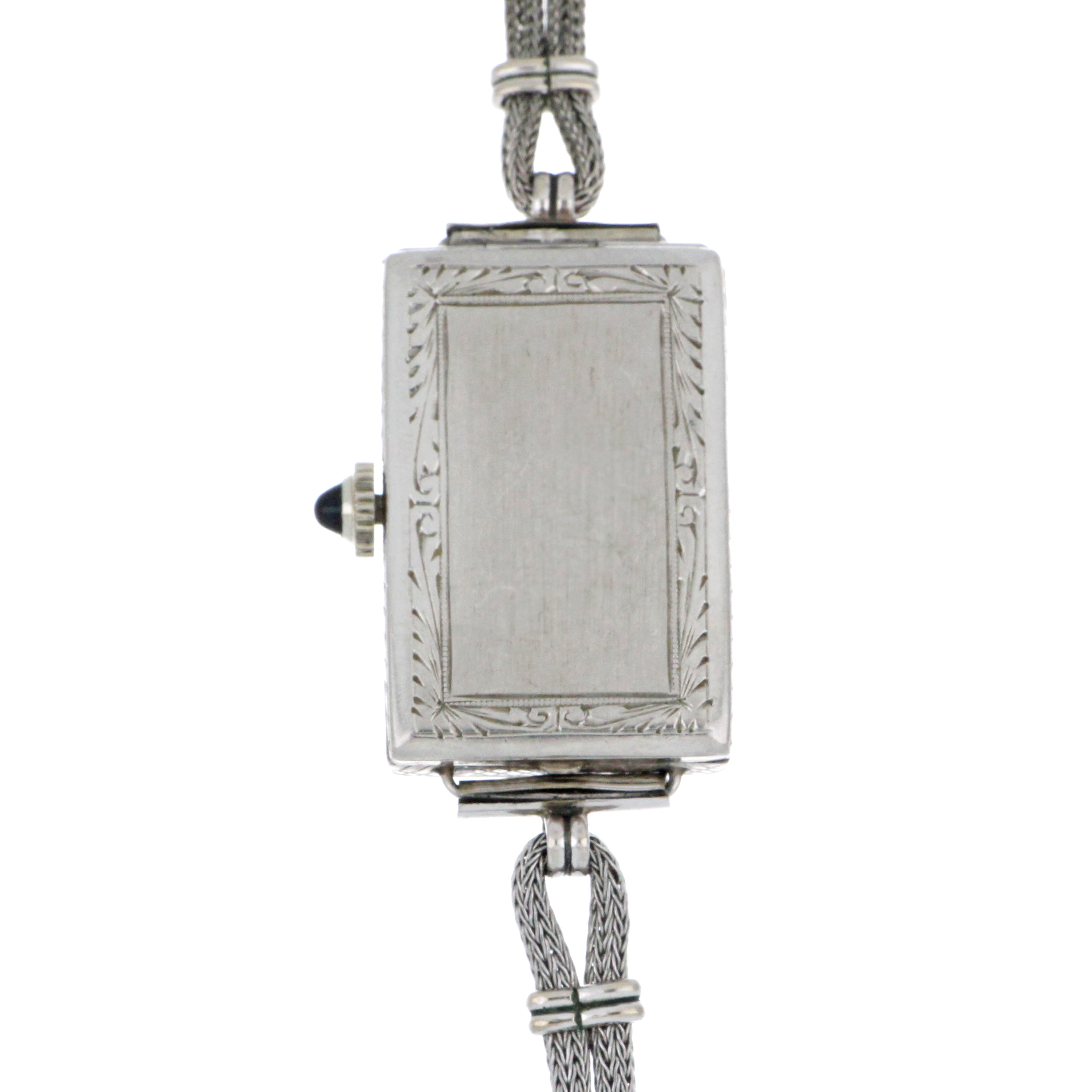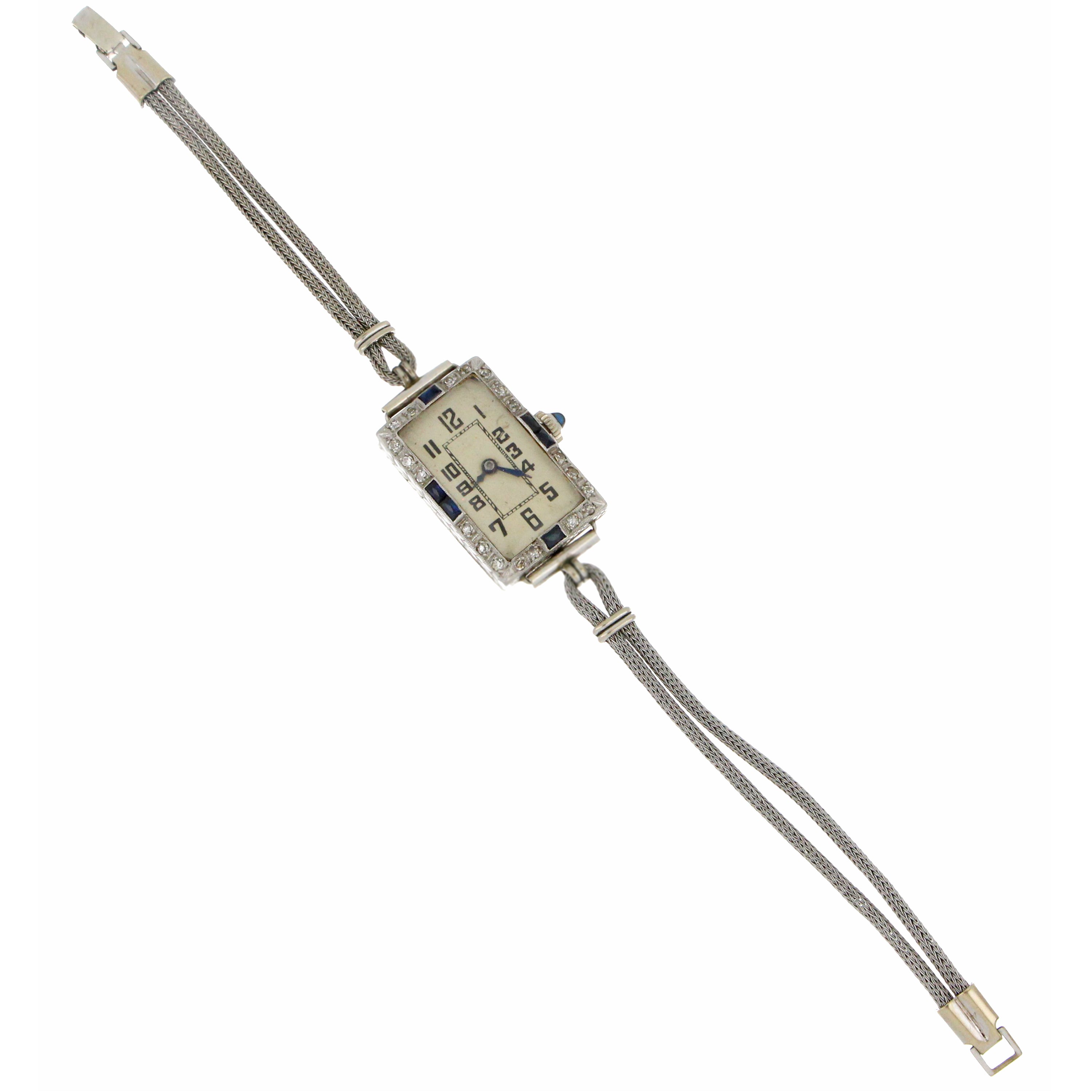 Ladies' Elem watch, original platinum case with diamonds and blue sapphires, manual wind movement, 17 jewels, white metal strap, 7 inch in length. The total weight of this watch is 18.40 grams.