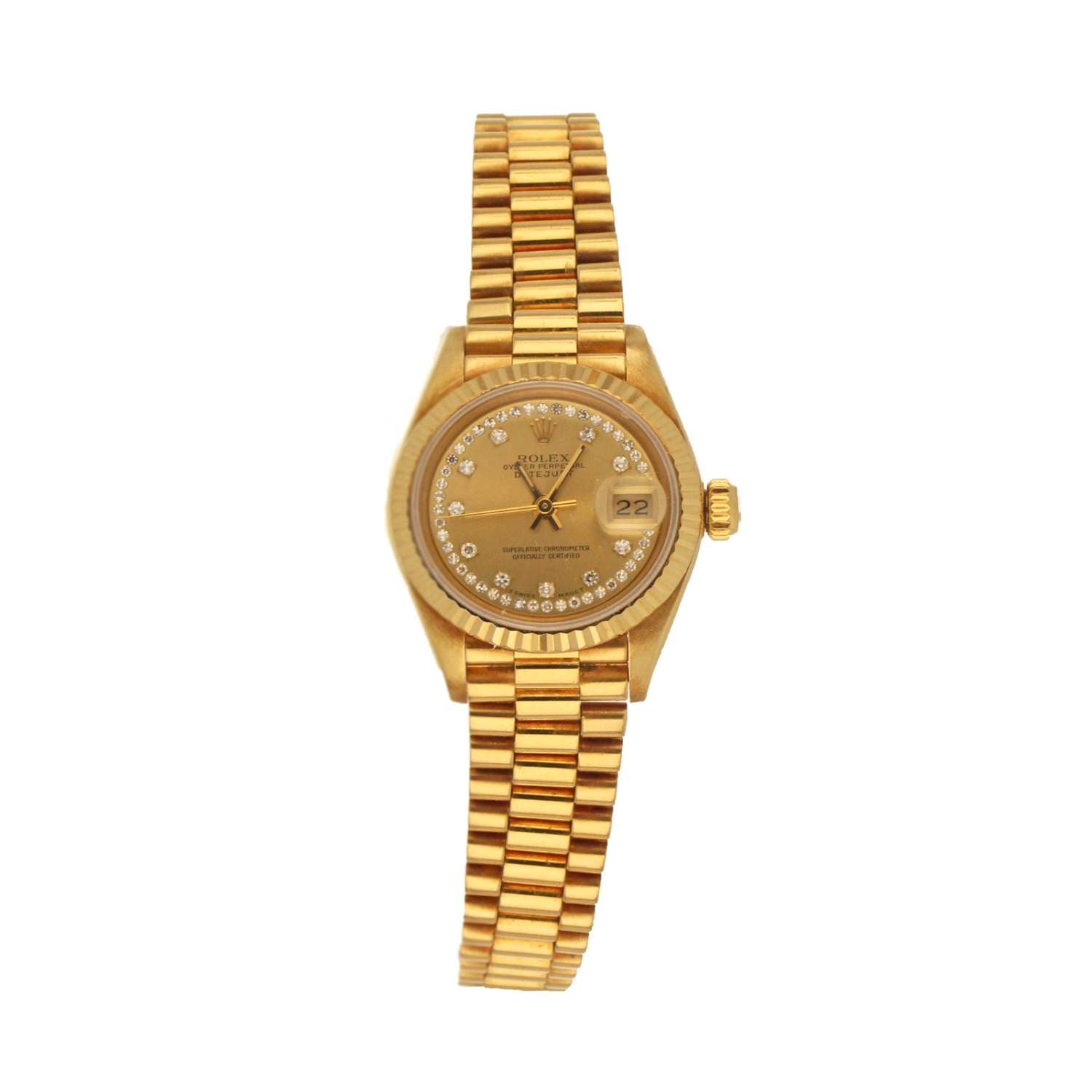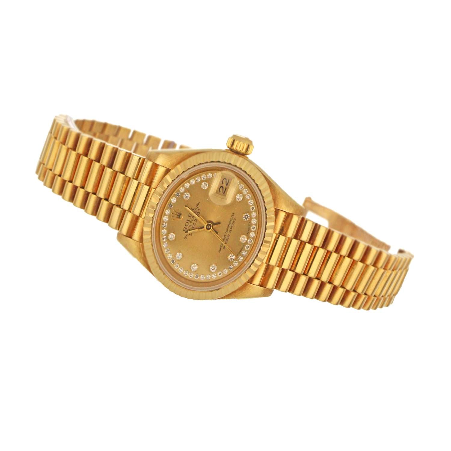 Ladies' Rolex Oyster Perpetual Datejust, original 18kt yellow gold case and president bracelet, diamond dail, model# 69178, serial# 9289280, caliber# 2135, 29 jewels, movement# 407636, circa 1985, without original Rolex box or certificate.