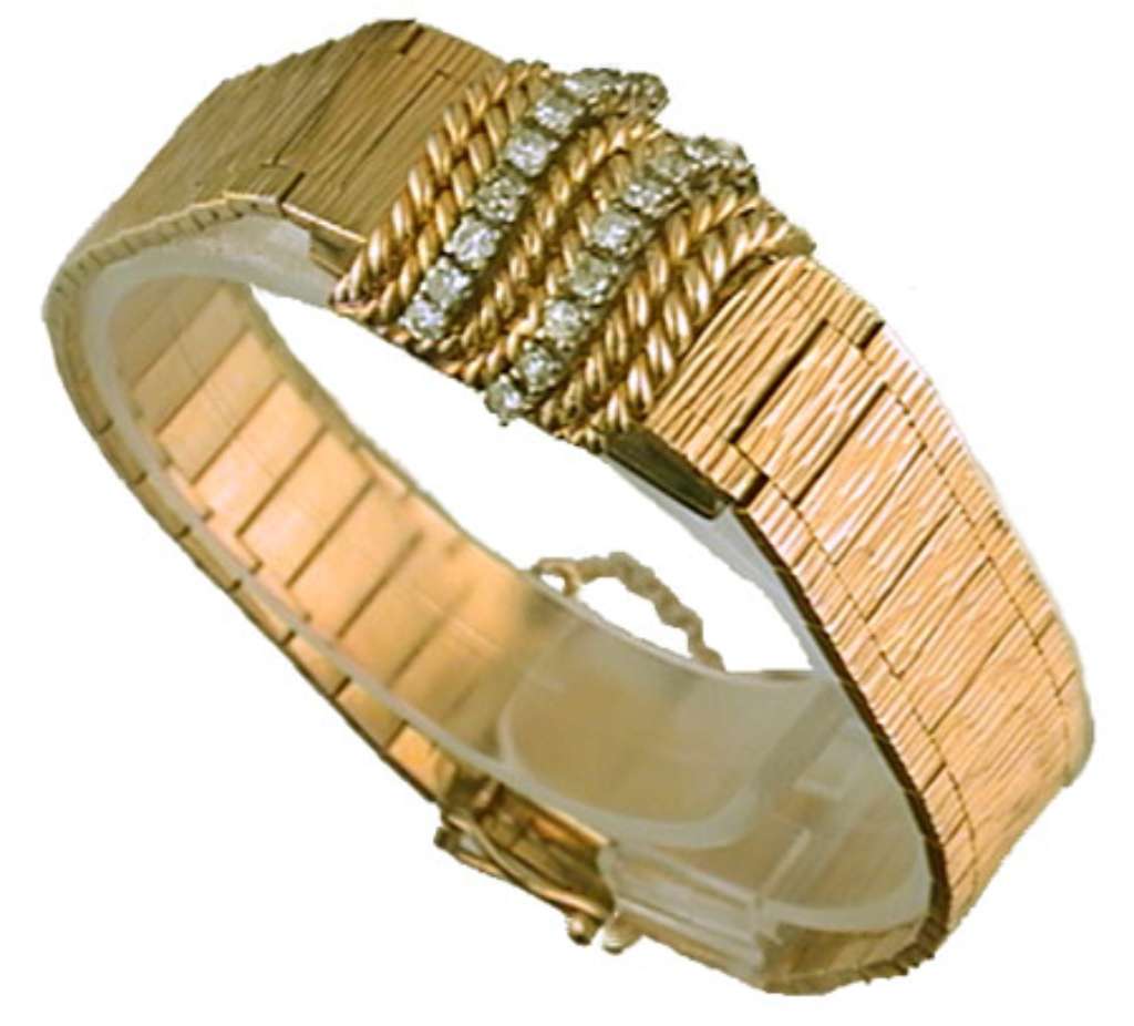 Ladies' Wakmann watch, original 14kt yellow gold hidden face case and bracelet, manual wind movement, 17 jewels, hidden face, 18 pieces of single cut diamonds set on the case cover, 39.91 grams.