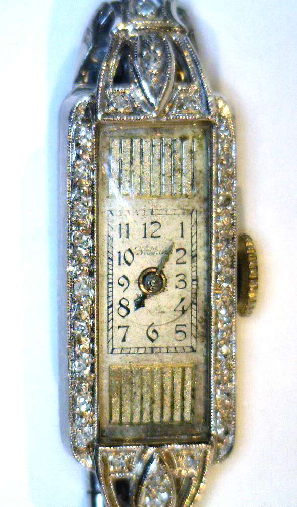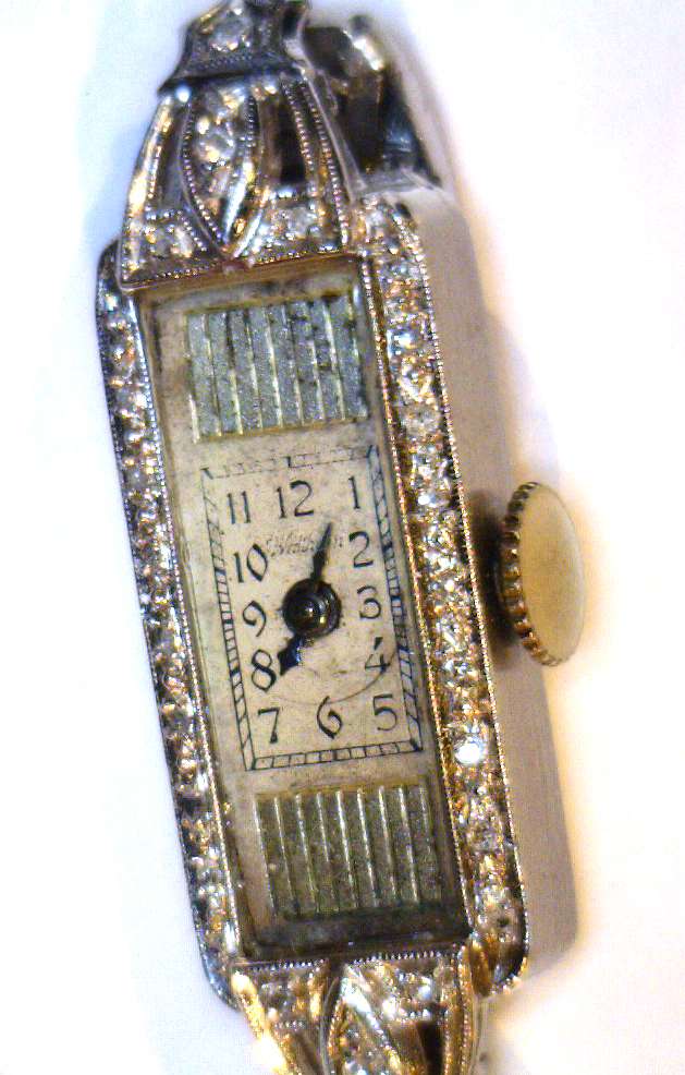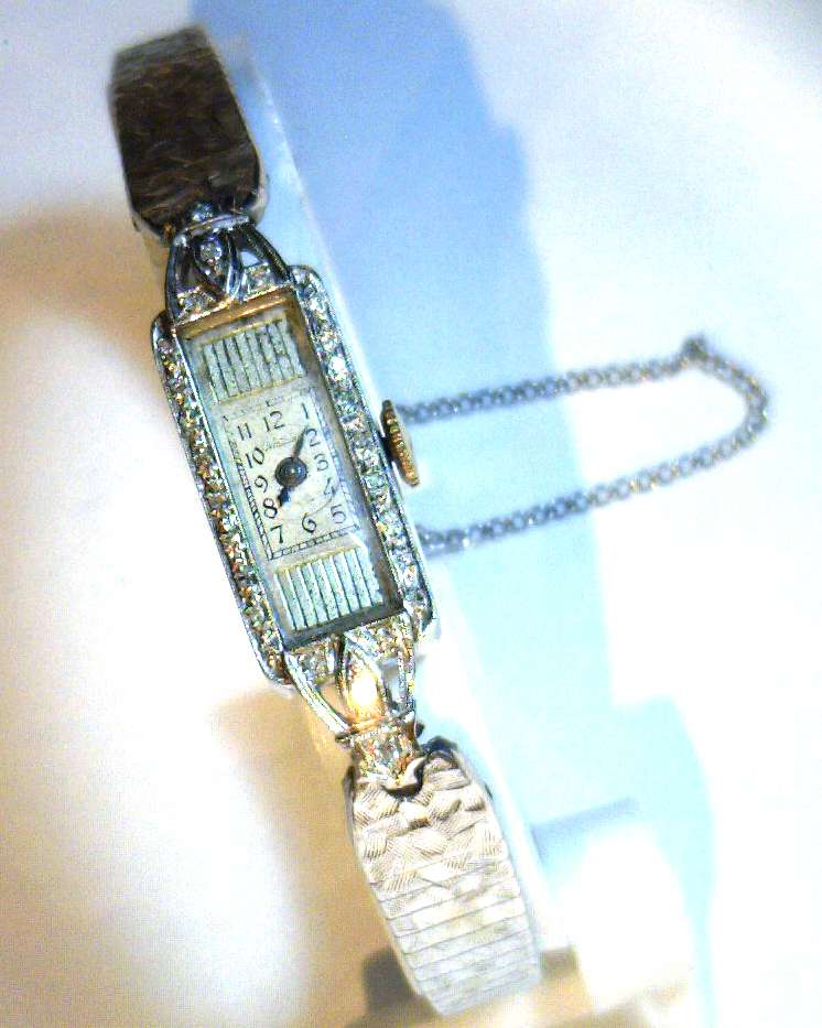 Ladies' Waltham platinum and single cut diamonds case watch, with white color metal bracelet, manual wind movement, 17 jewels, movement# 1224, the total weight of this watch is 17.22 grams.