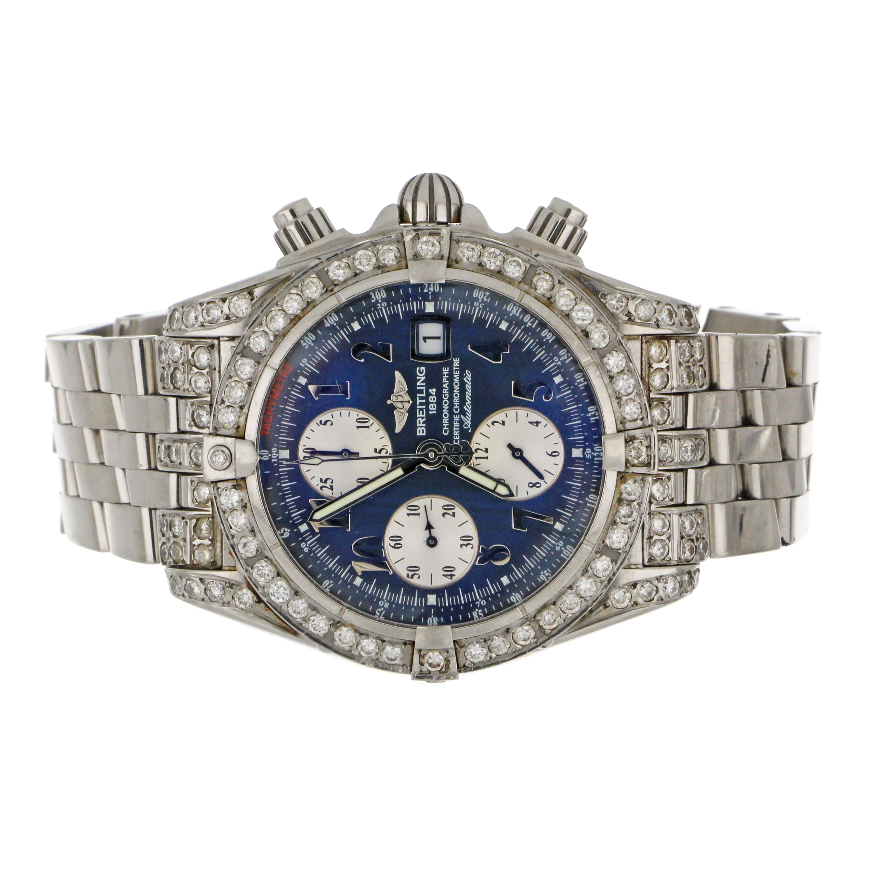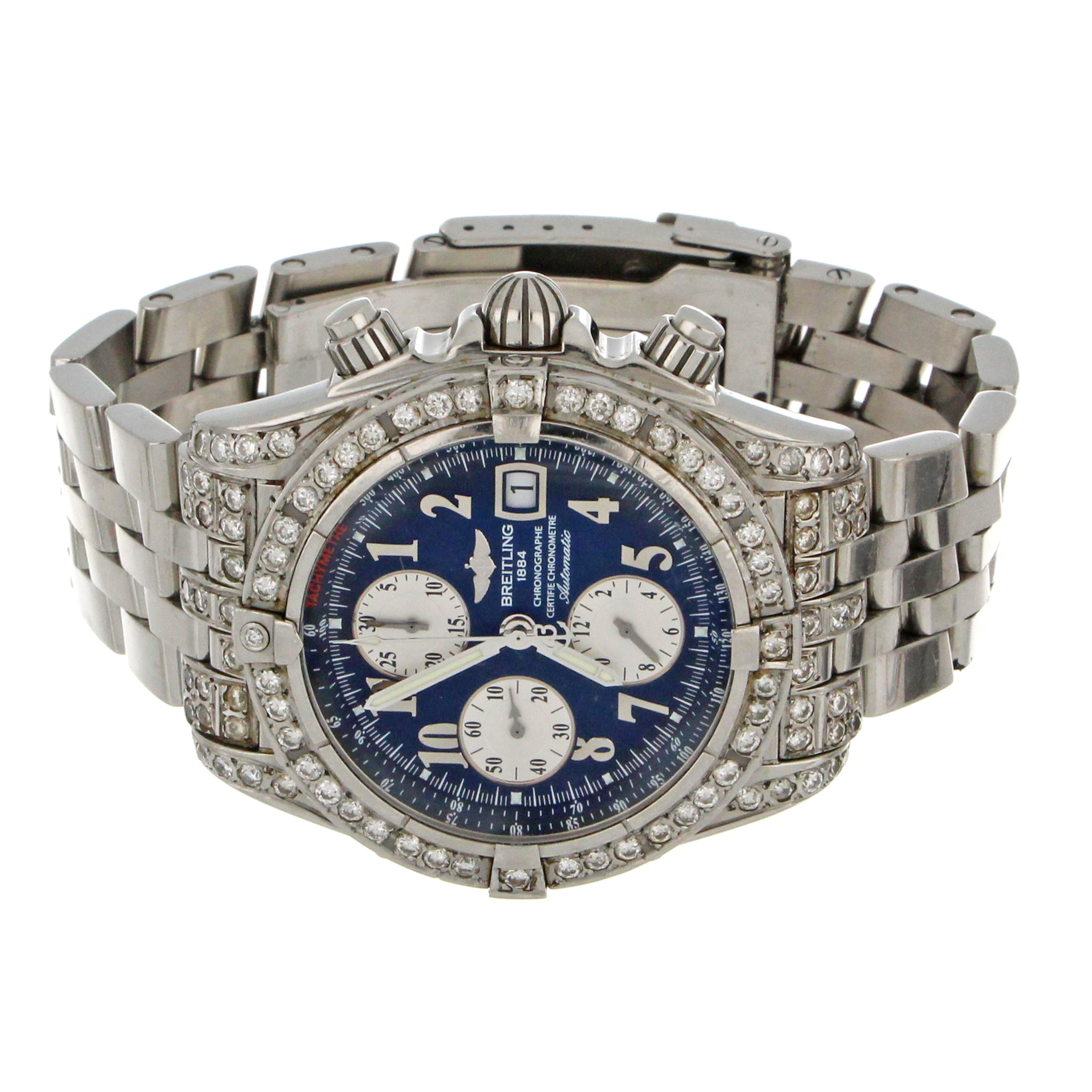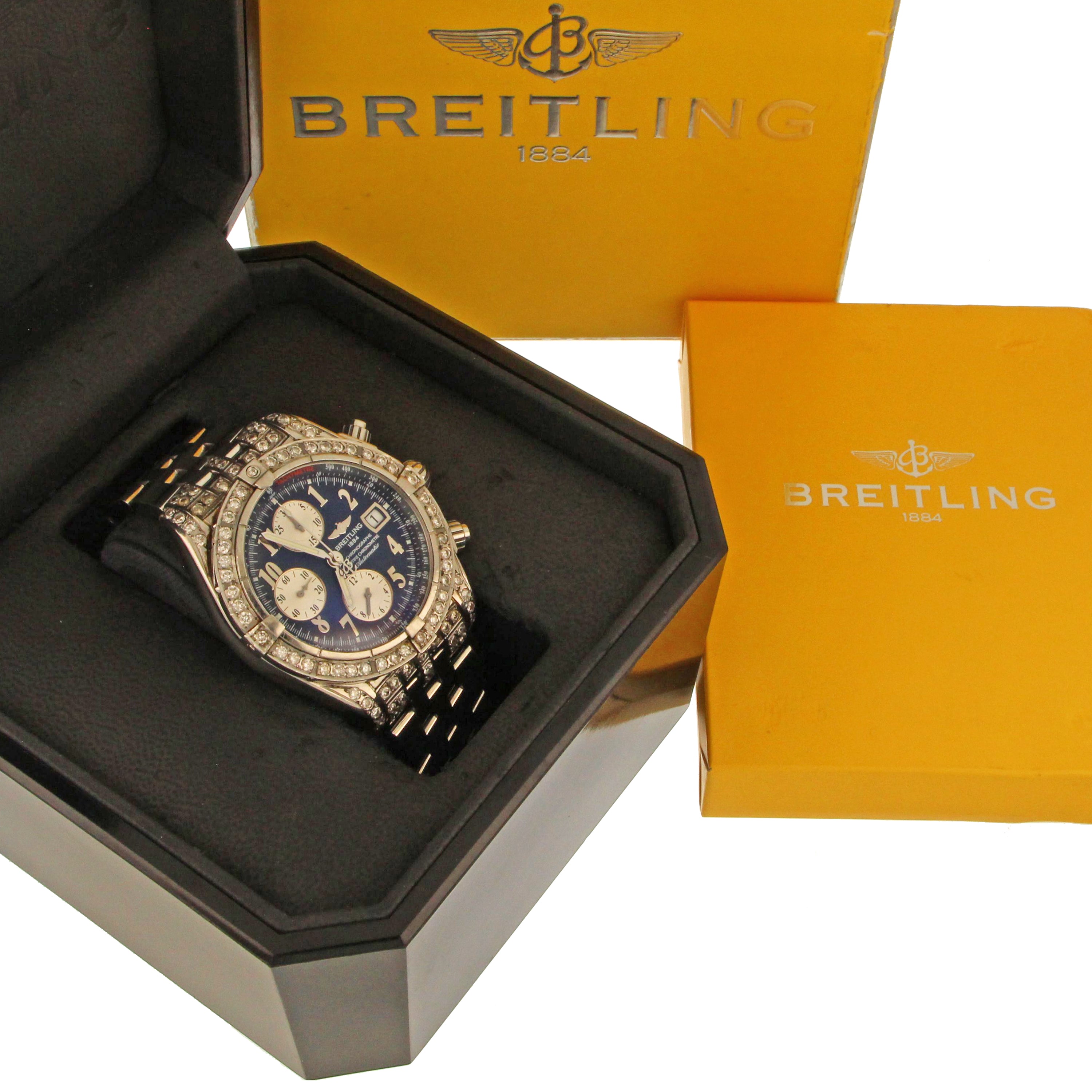 Mens' Breitling Chronomat Evolution, original stainless steel case and bracelet, secondary market diamond bezel and diamond lugs, blue dial with 3 silver sub-dials, model# A13356, serial# 21662XX, caliber# Breitling 13, 25 jewels, 42 hours power reserve, case diameter: 43mm, stainless steel fold clasp, with original Breitling box, certificate and booklet.