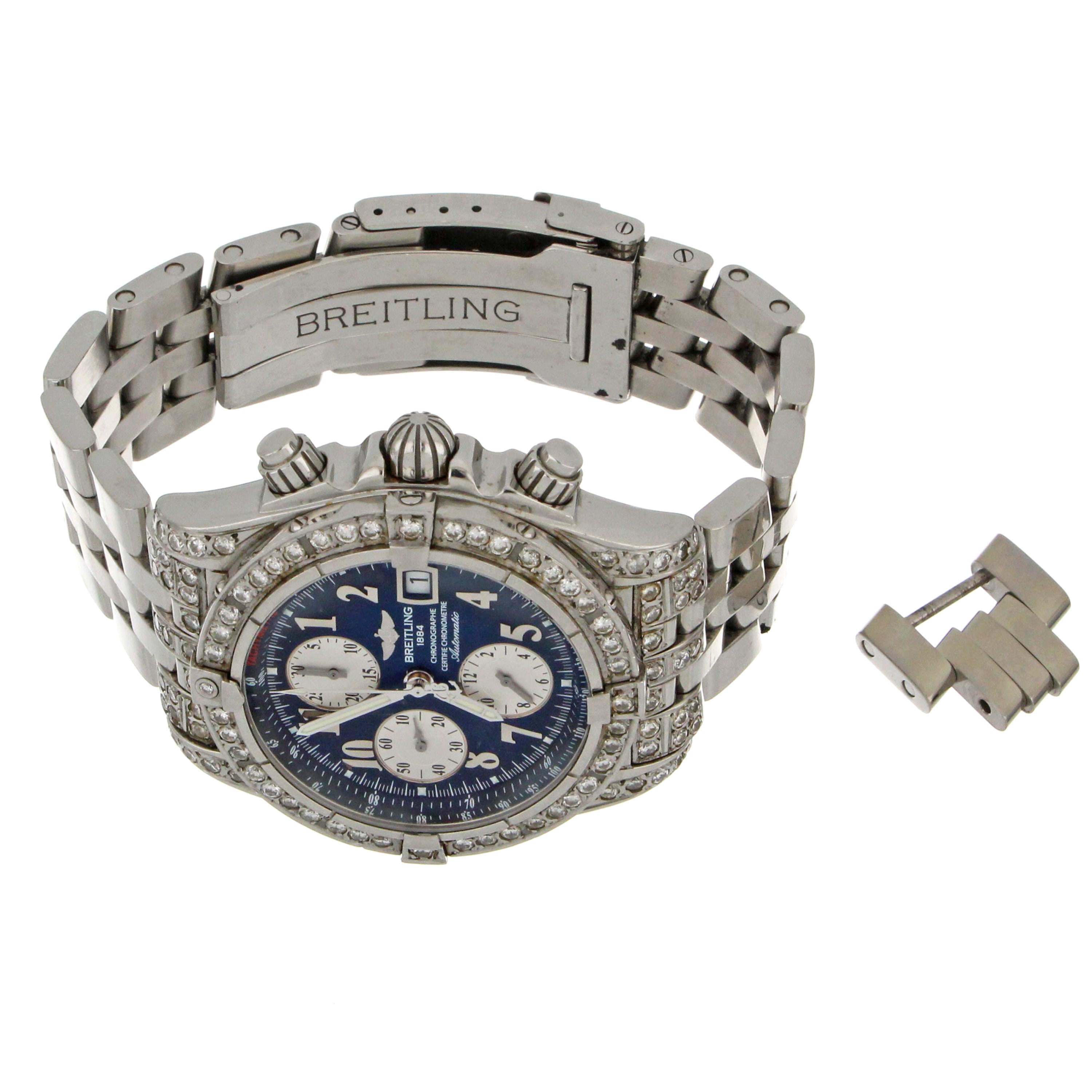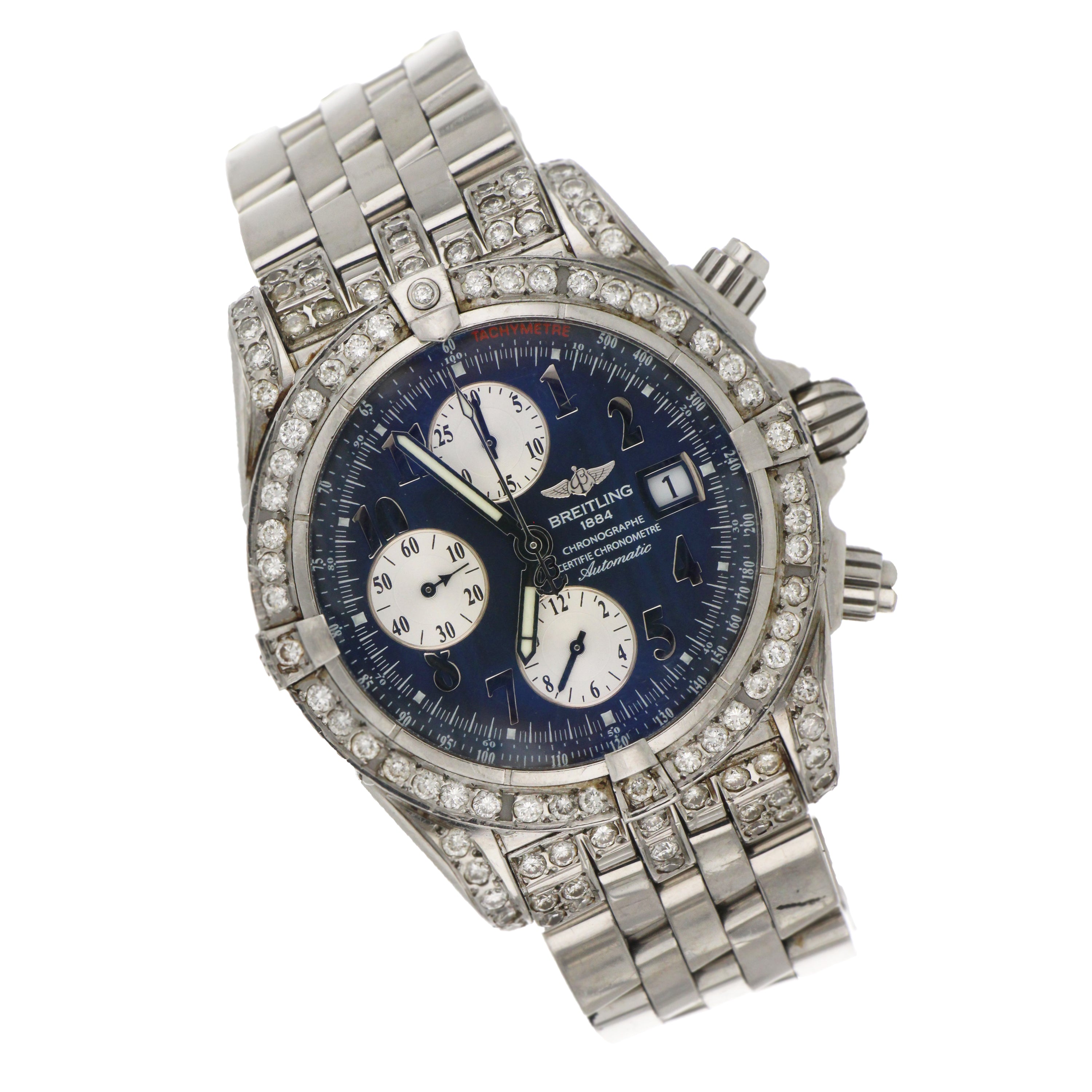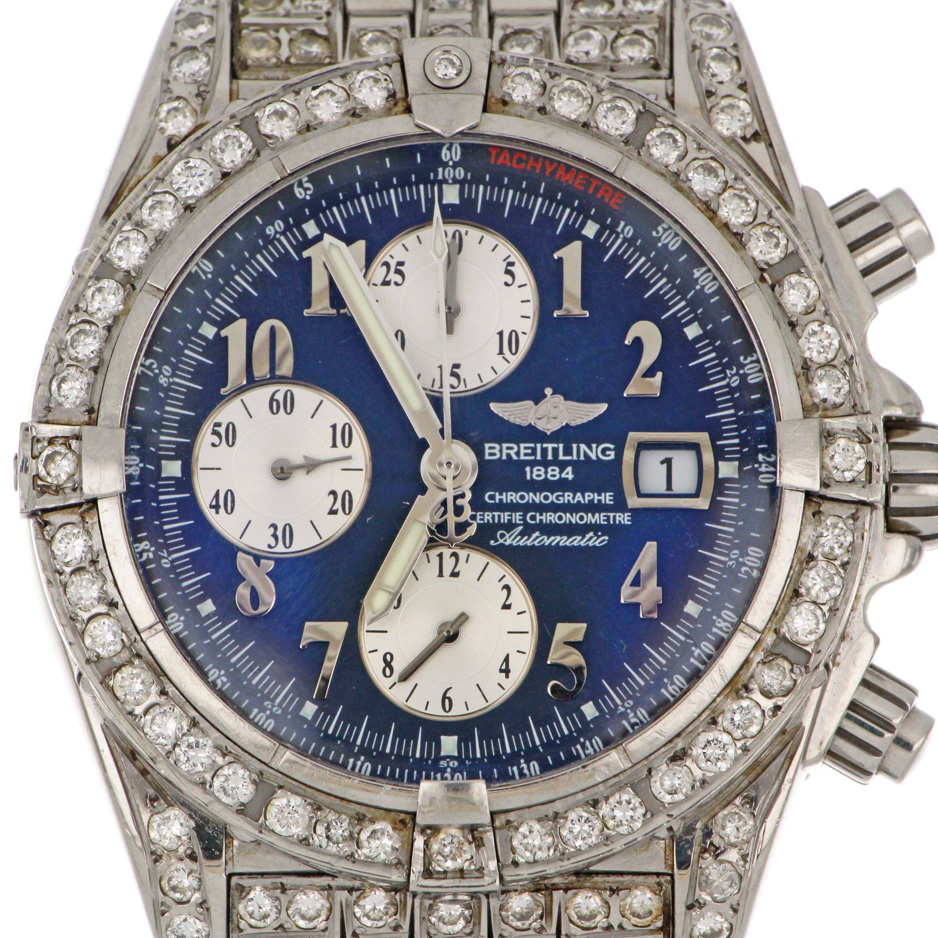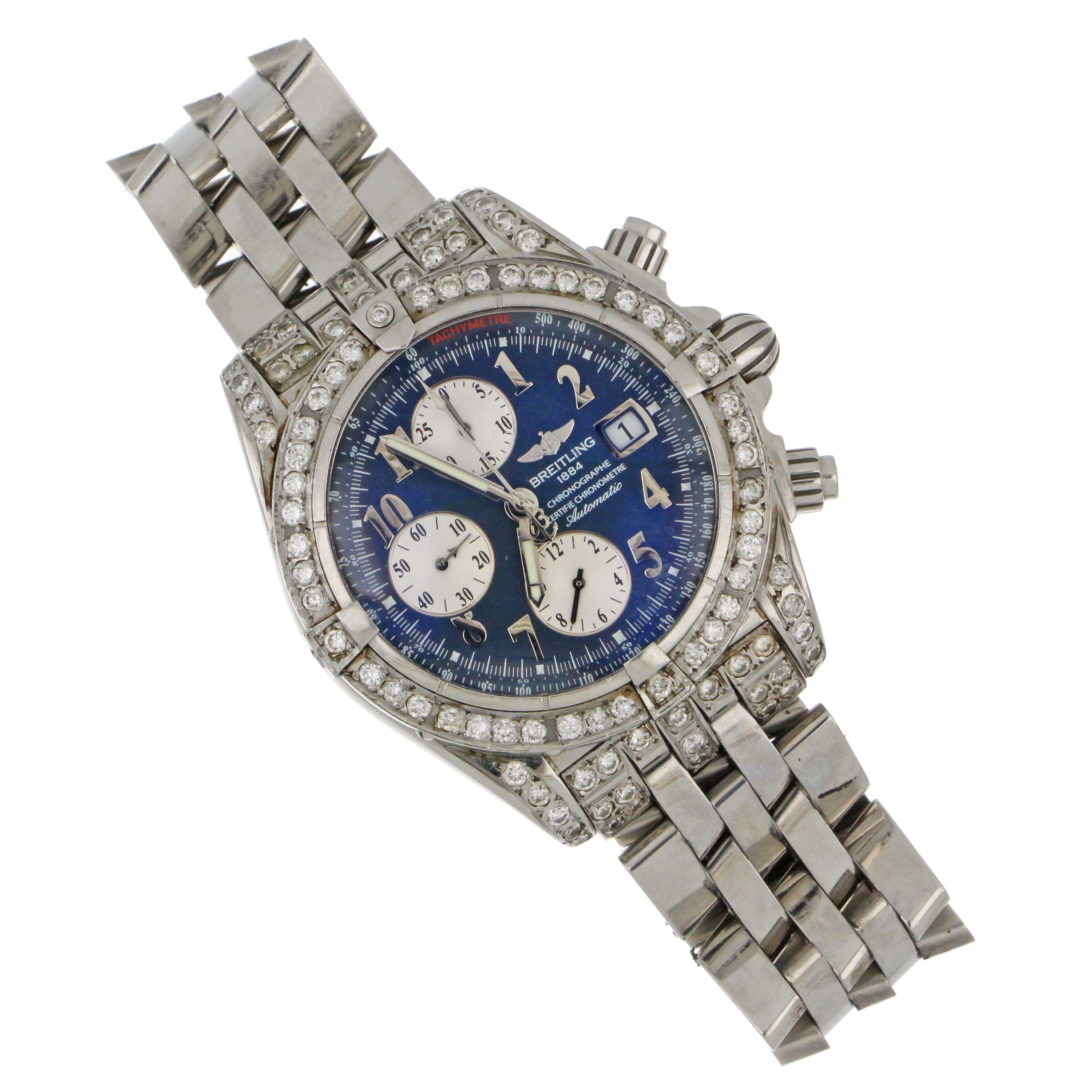 Mens' Breitling Chronomat Evolution, original stainless steel case and bracelet, secondary market diamond bezel and diamond lugs, blue dial with 3 silver sub-dials, model# A13356, serial# 21662XX, caliber# Breitling 13, 25 jewels, 42 hours power reserve, case diameter: 43mm, stainless steel fold clasp, with original Breitling box, certificate and booklet.