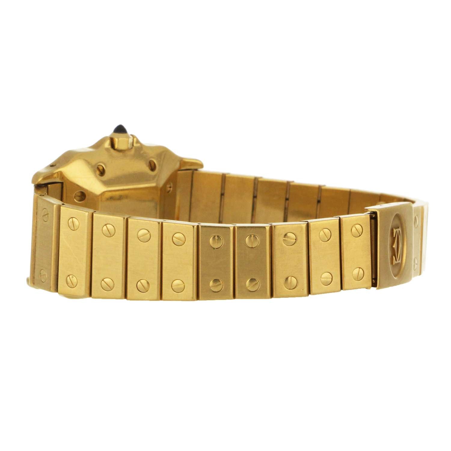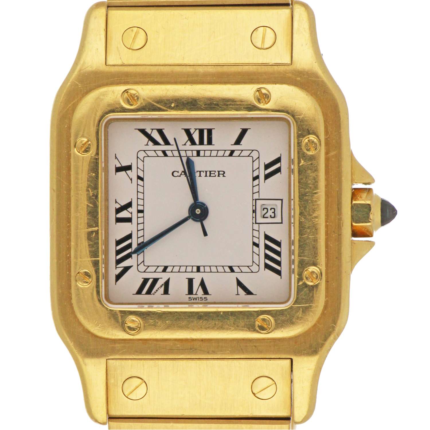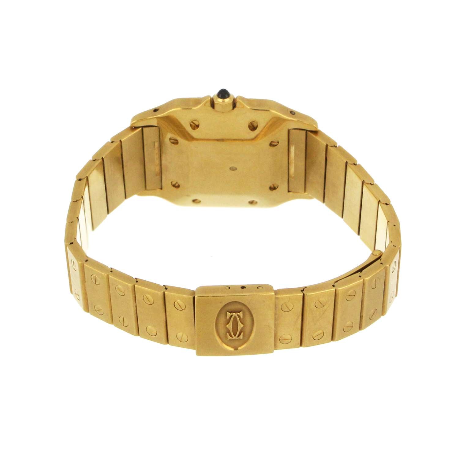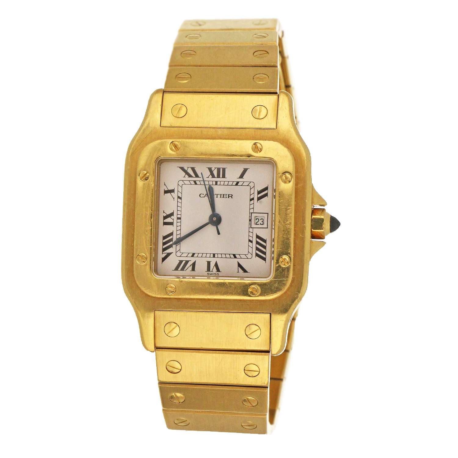 Men's Cartier Santos, original 18kt yellow gold case and bracelet, white dial with date, automatic movement, caliber# 2671, 25 jewels, ETA V8ZB5, without original Cartier box or certificate.