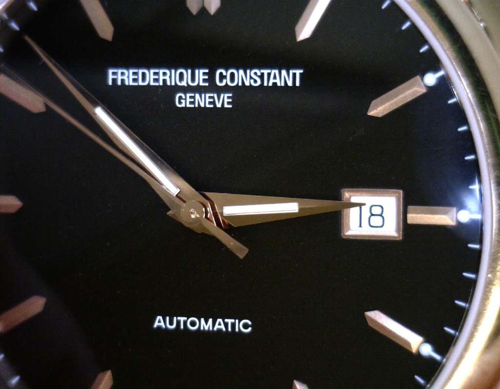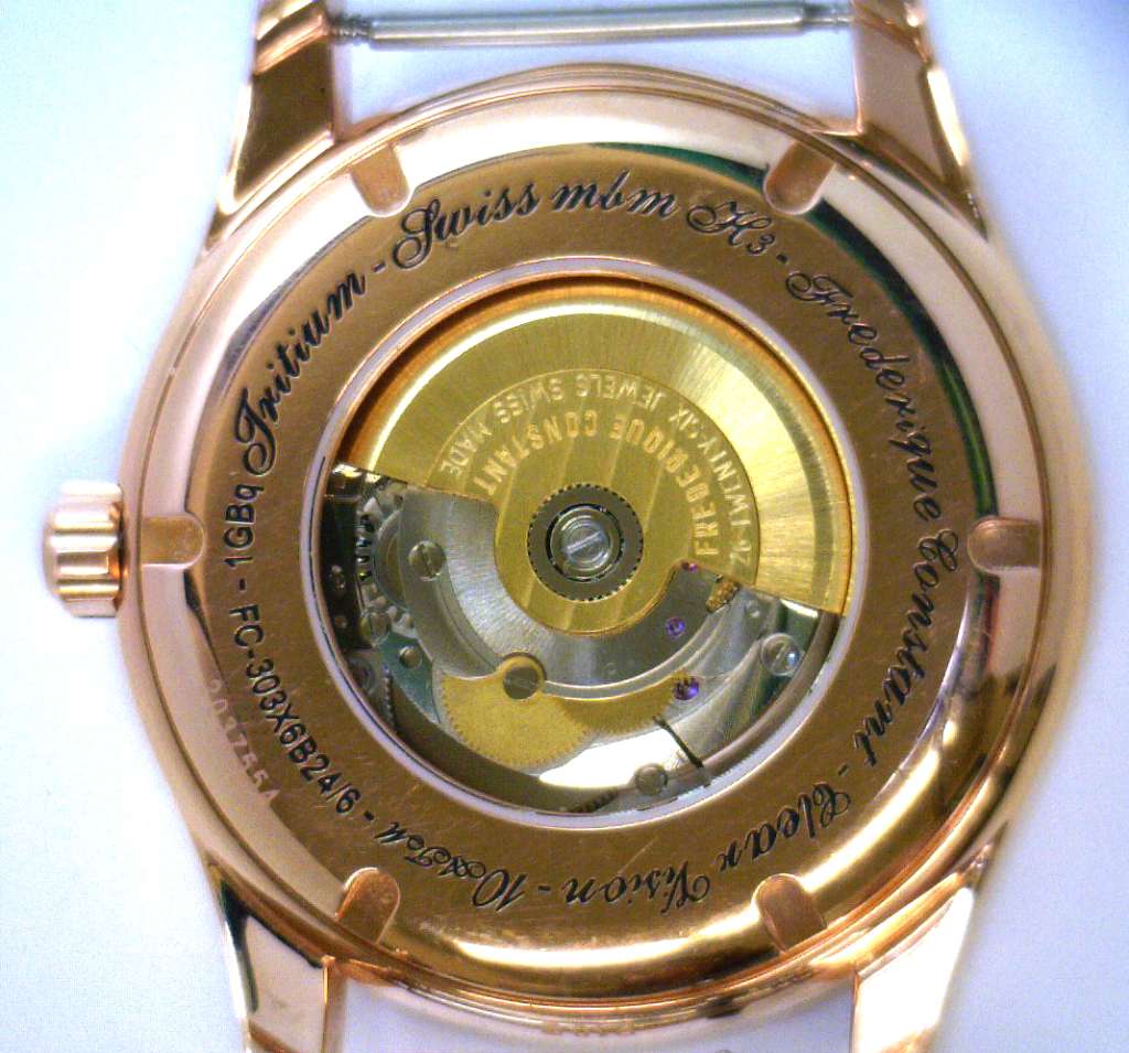 Men's Frederique Constant, original rose color case, black dial with date with classic index, ref# FC-303X6B24/6, automatic movement, 26 jewels, serial# 2037554, transparent backing, without 23mm leather strap, original watch ox or certificate.