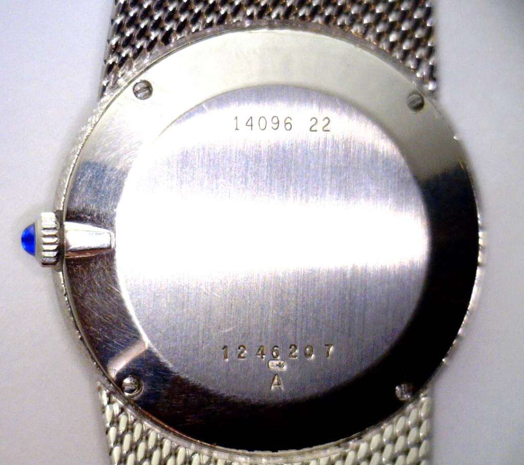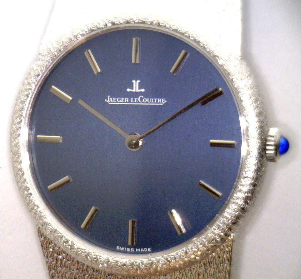 Mens' Jaeger-LeCoultre Watch, original 18kt white gold case and bracelet, greyish-blue color dial, cabochon cut blue sapphire crown, manual wind movement, caliber# 838/1, 19 jewels, serial# 2209778, on the back case: 14096 22, 1246207, 80.81 grams.