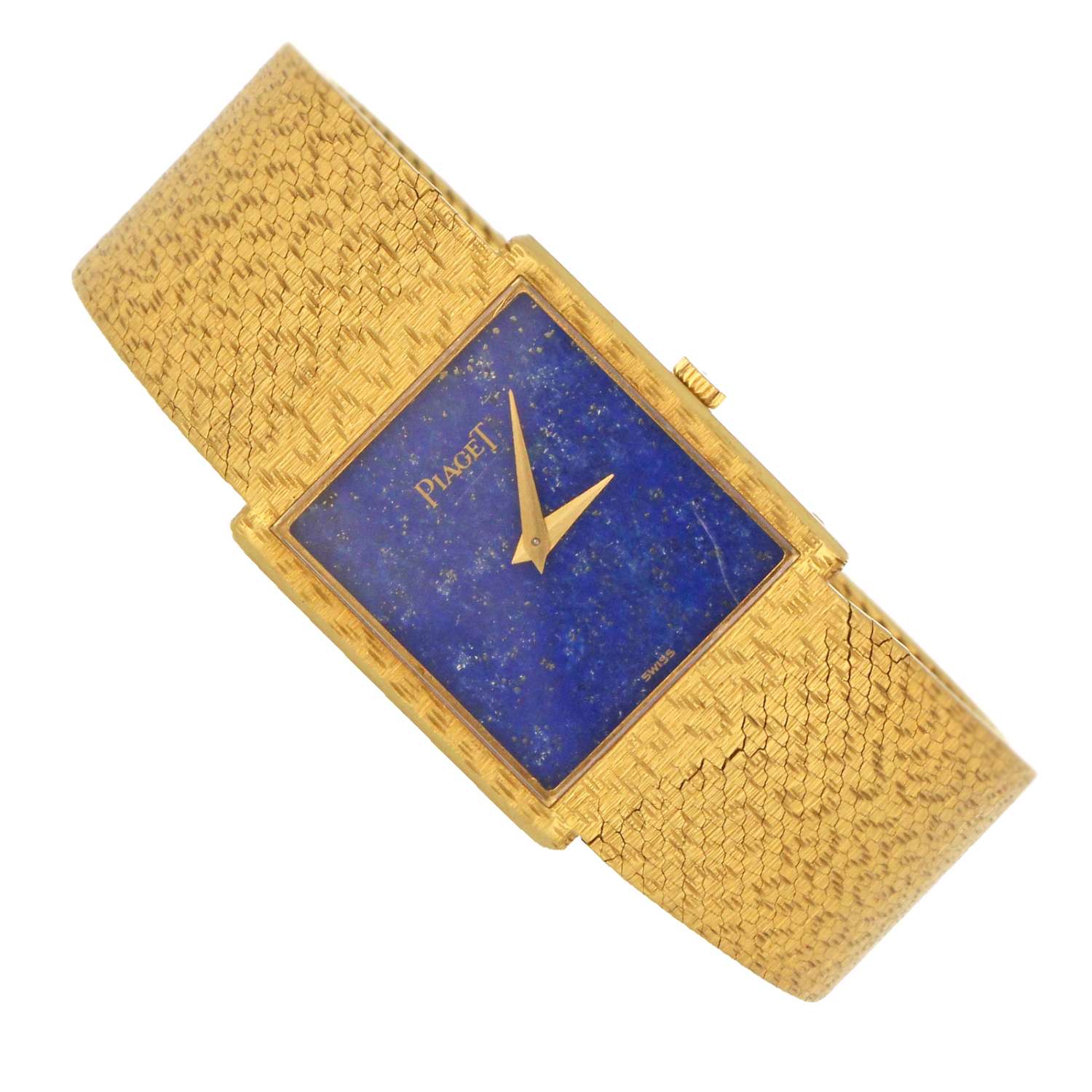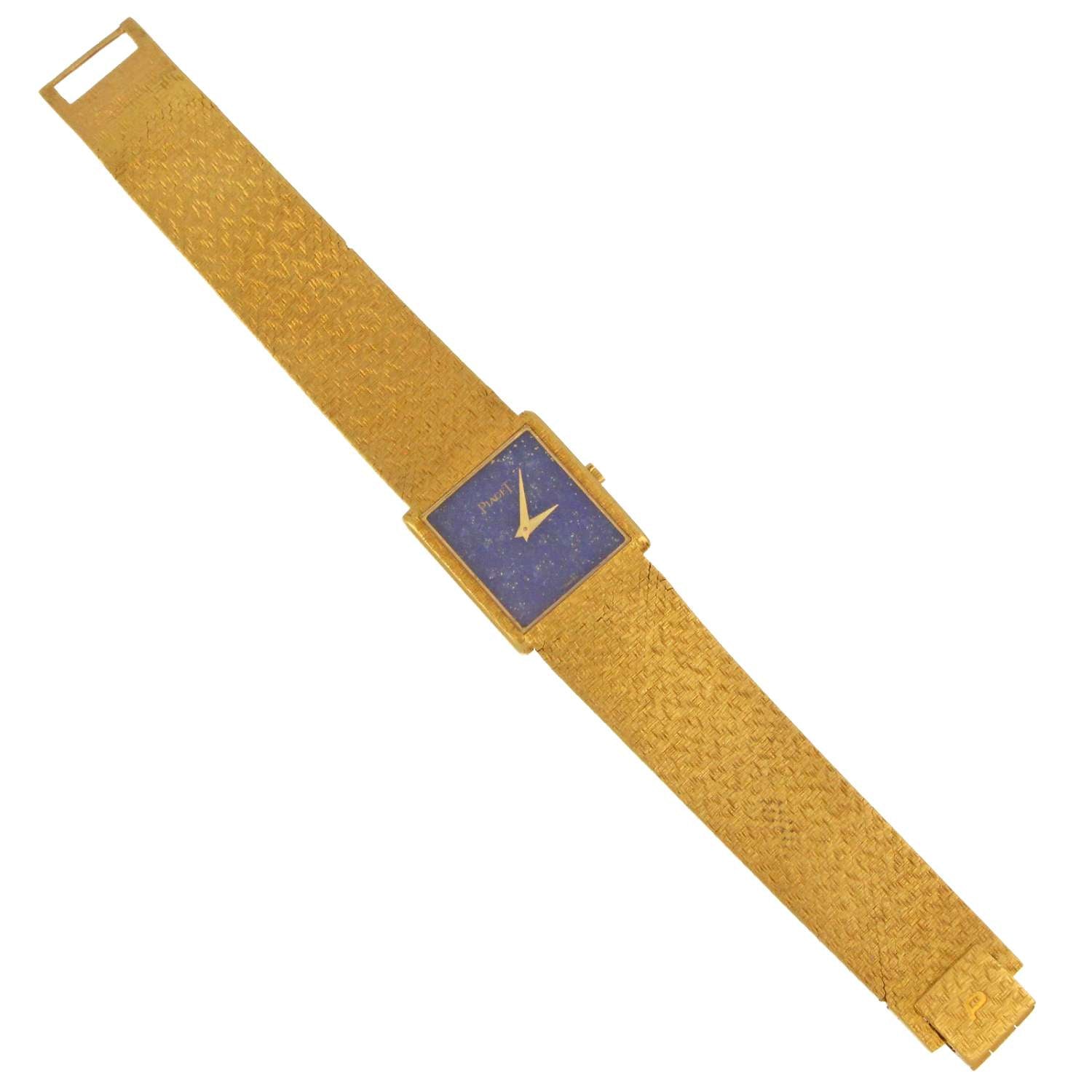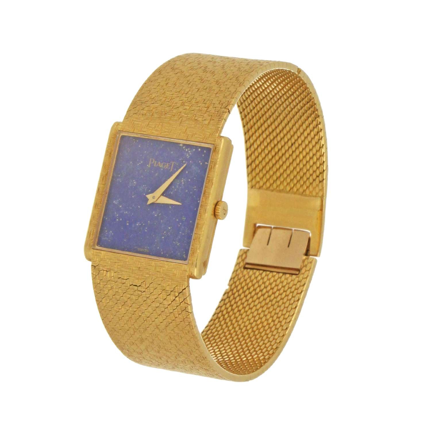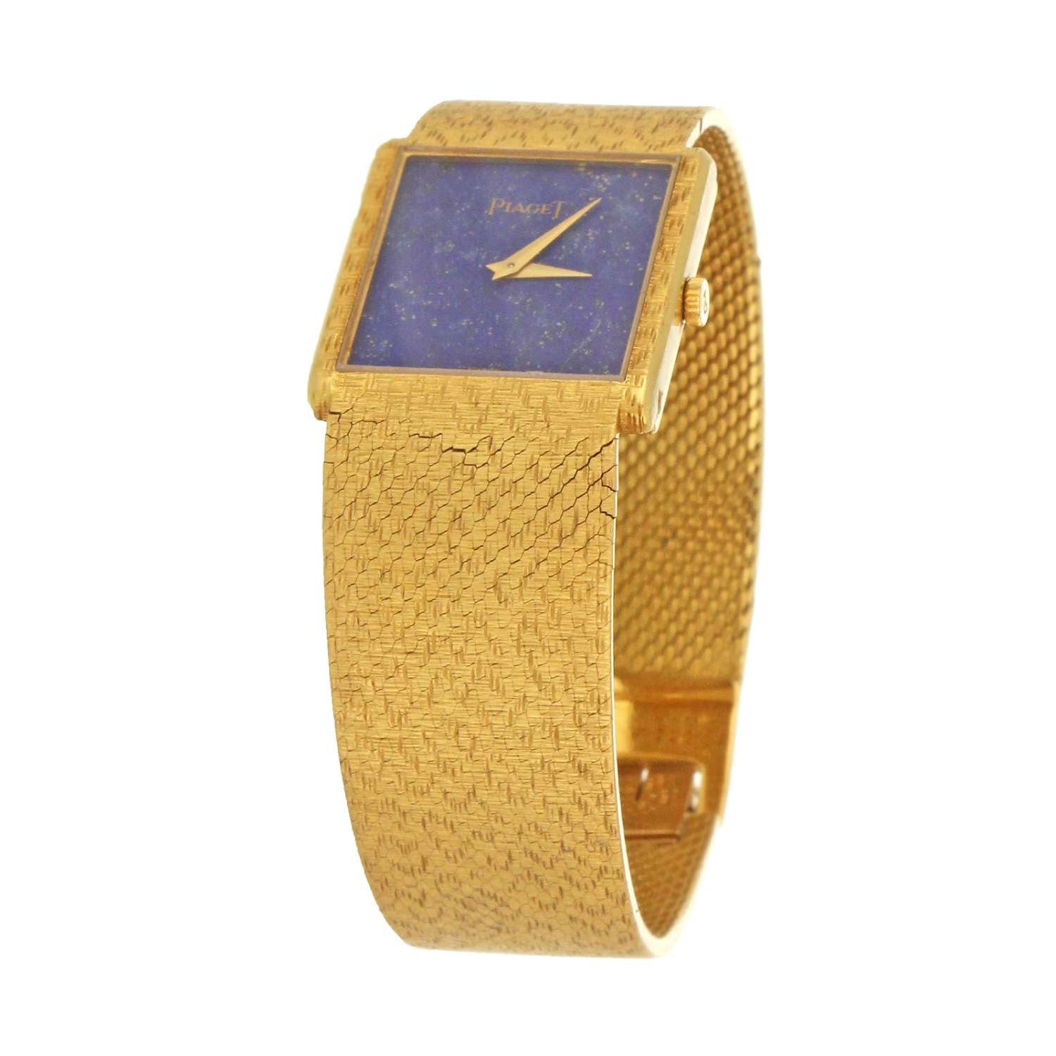 Men's Piaget watch, original 18kt yellow gold case and bracelet, lapis lazuli dial, manual wind movement, caliber# 9P, 18 jewels, serial# 70049XX, case diameter: 25x23mm, 7 inches in length, 79.30 grams, without original Piaget watch box or certificate.