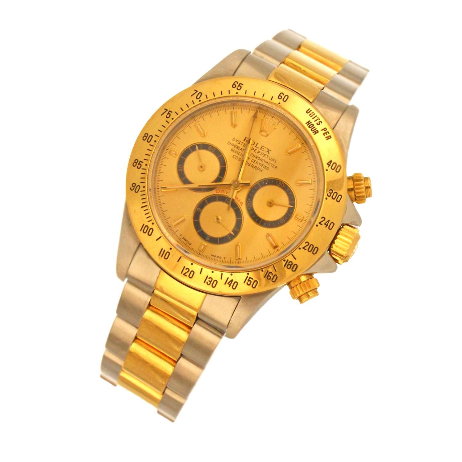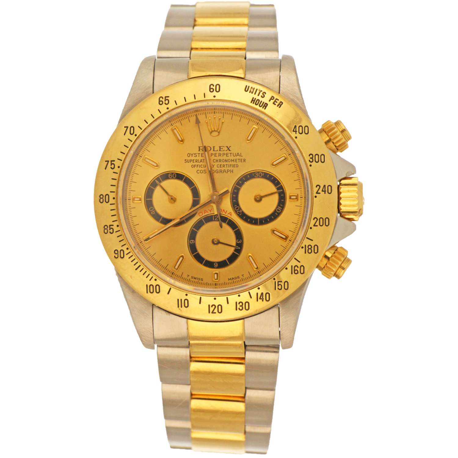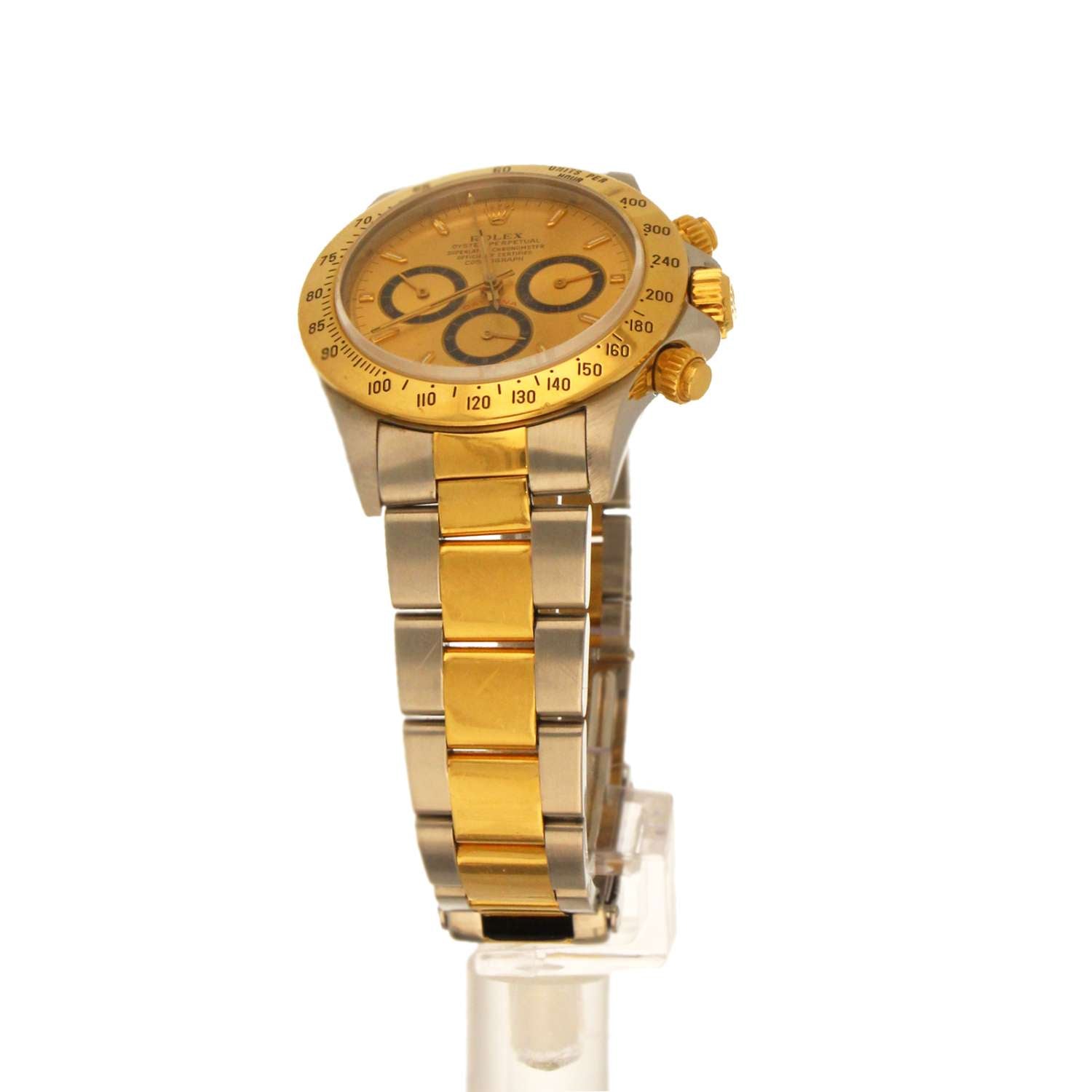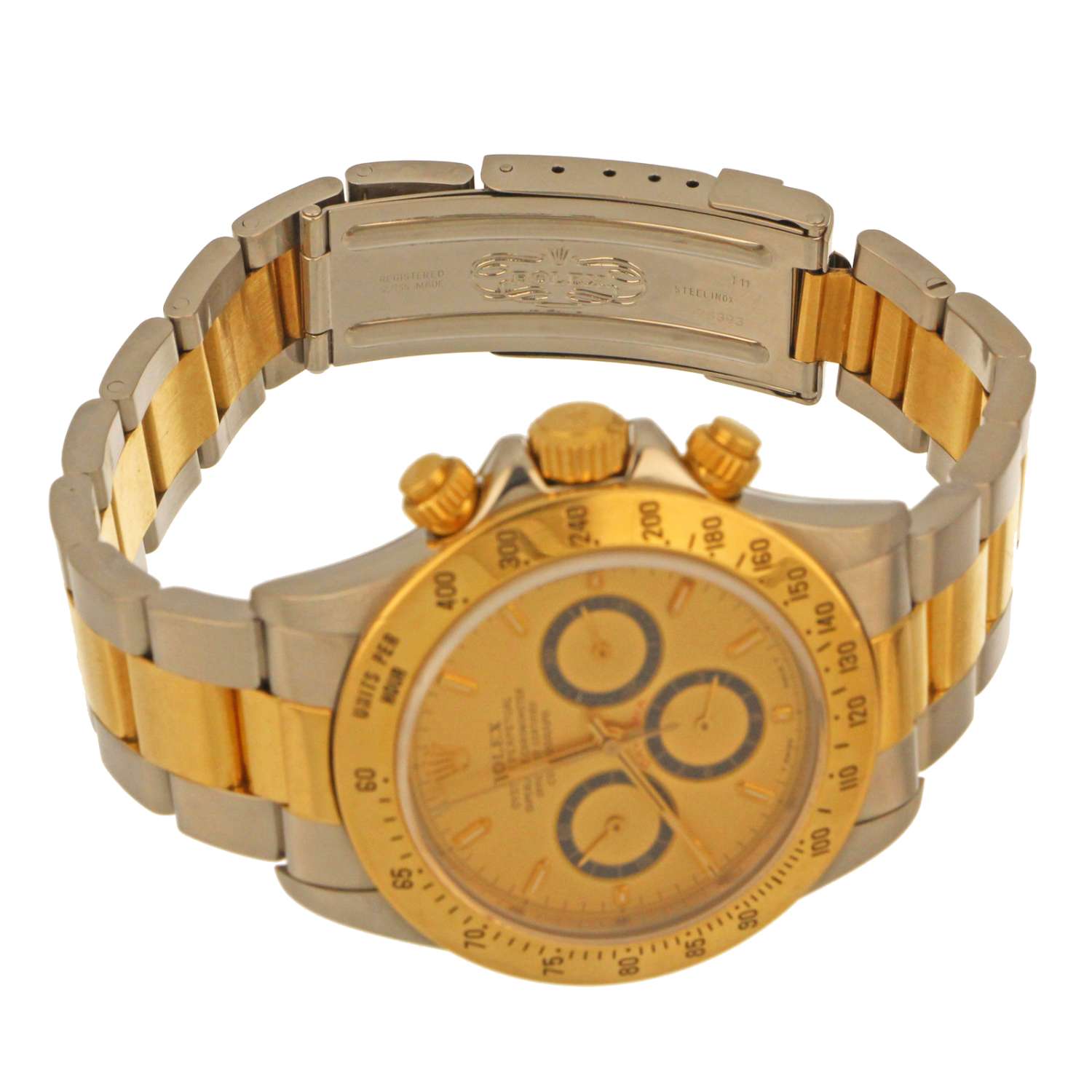 Mens' Rolex Oyster Perpetual Daytona, original 18kt yellow gold and stainless steel case and oyster bracelet, champagne dial, model# 16523, serial# W1125XX, caliber# 4030, 31 jewels, movement# 85055, circa 1994-1996, without original Rolex box and certificate.