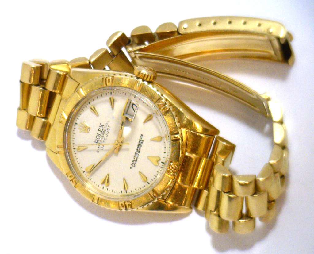 Mens' Rolex Oyster Perpetual Turnograph Datejust, original 18kt yellow gold case and president bracelet, model# 6609, serial# 148672, caliber# 1065, 25 jewels, movement# 654804, case diameter: 36mm, plexiglass, circa 1956, without original Rolex box or certificate.