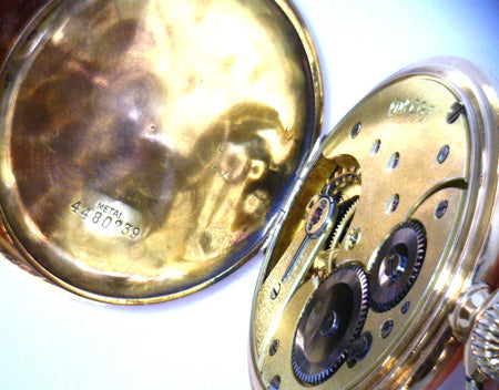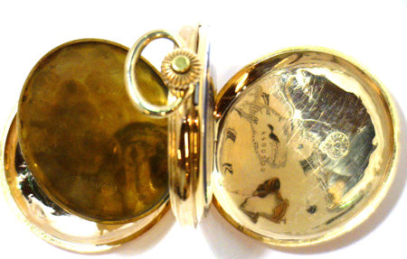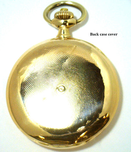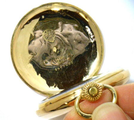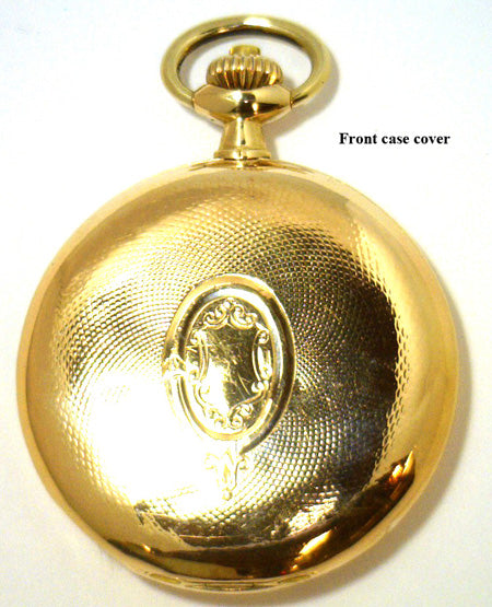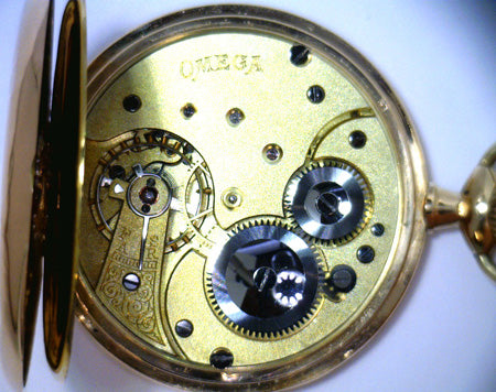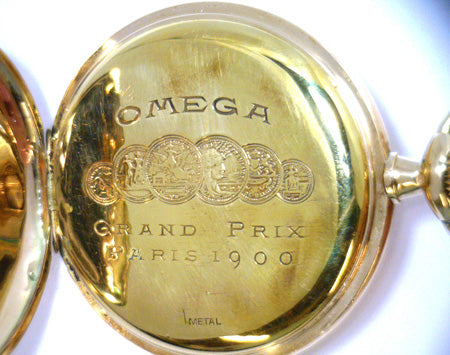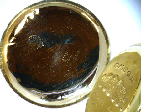 Omega pocket watch, original 14kt yellow gold hunter case, white color porcelain dial, manual wind movement, on the case# 4480239, 12 size, circa 1900, 60.73 grams.