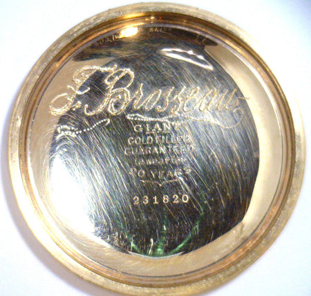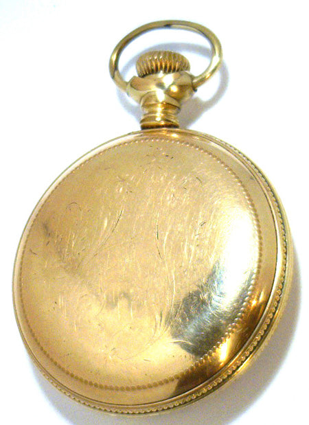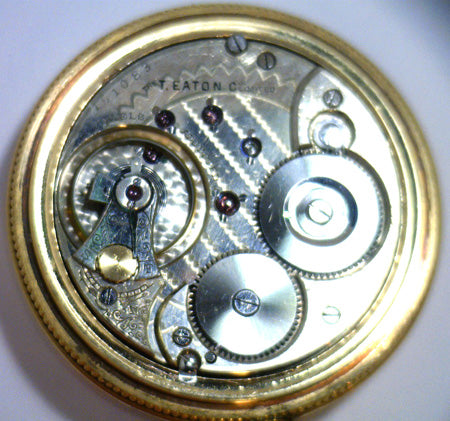 The T. Eaton pocket watch, gold filled crew back case, white color porcelain dial, manual wind movement, 17 jewels, movement# 151083, not original Eaton pocket watch case and case# 231820.