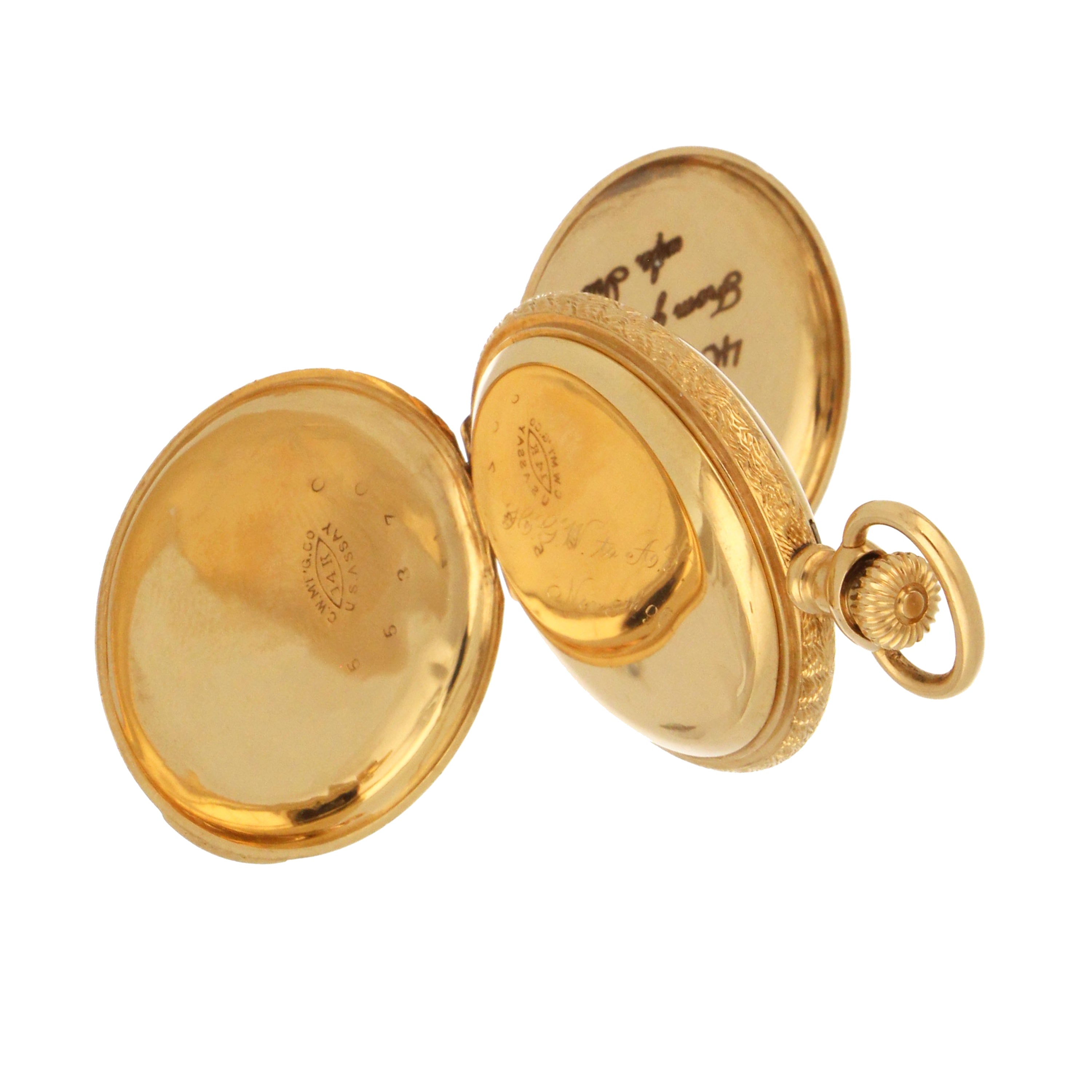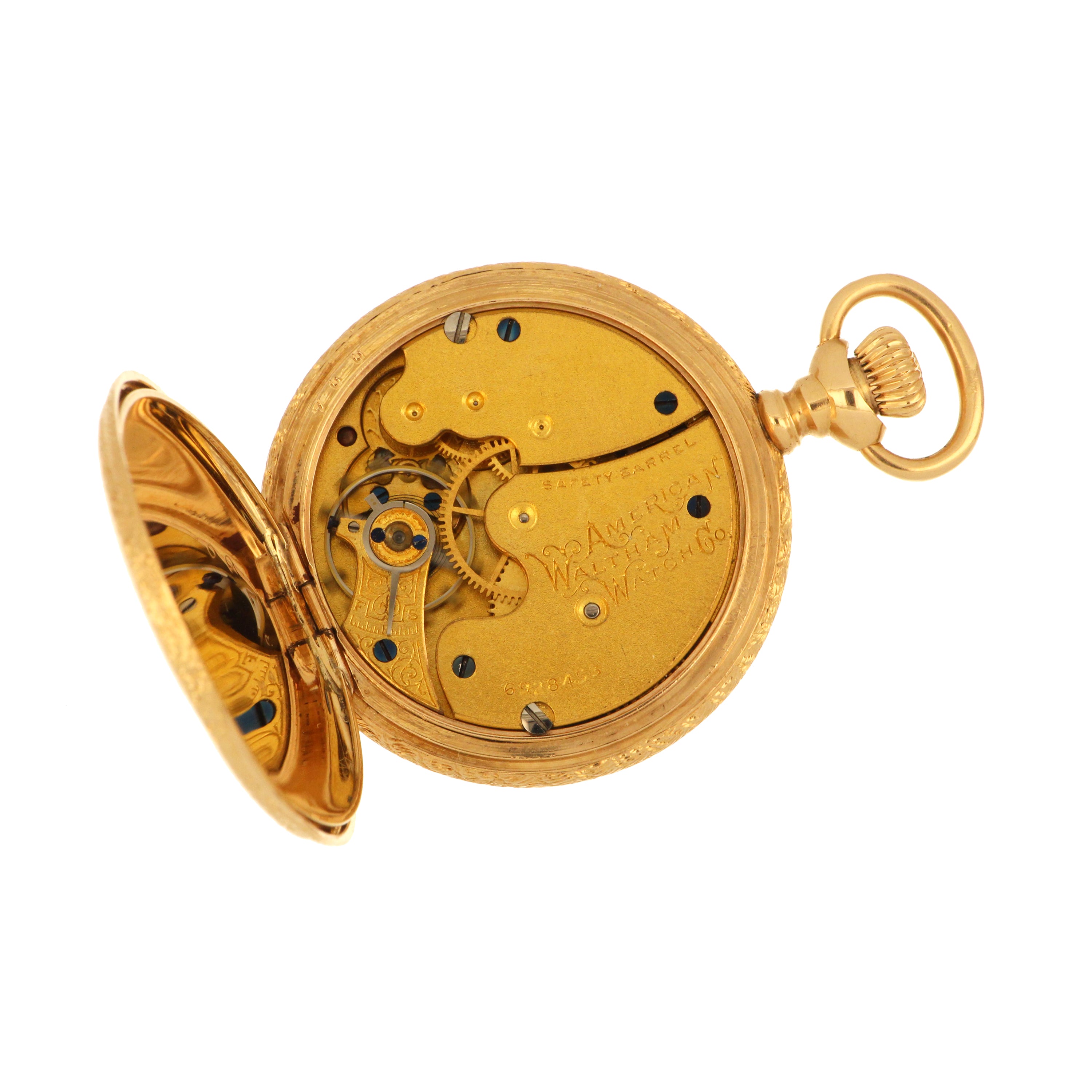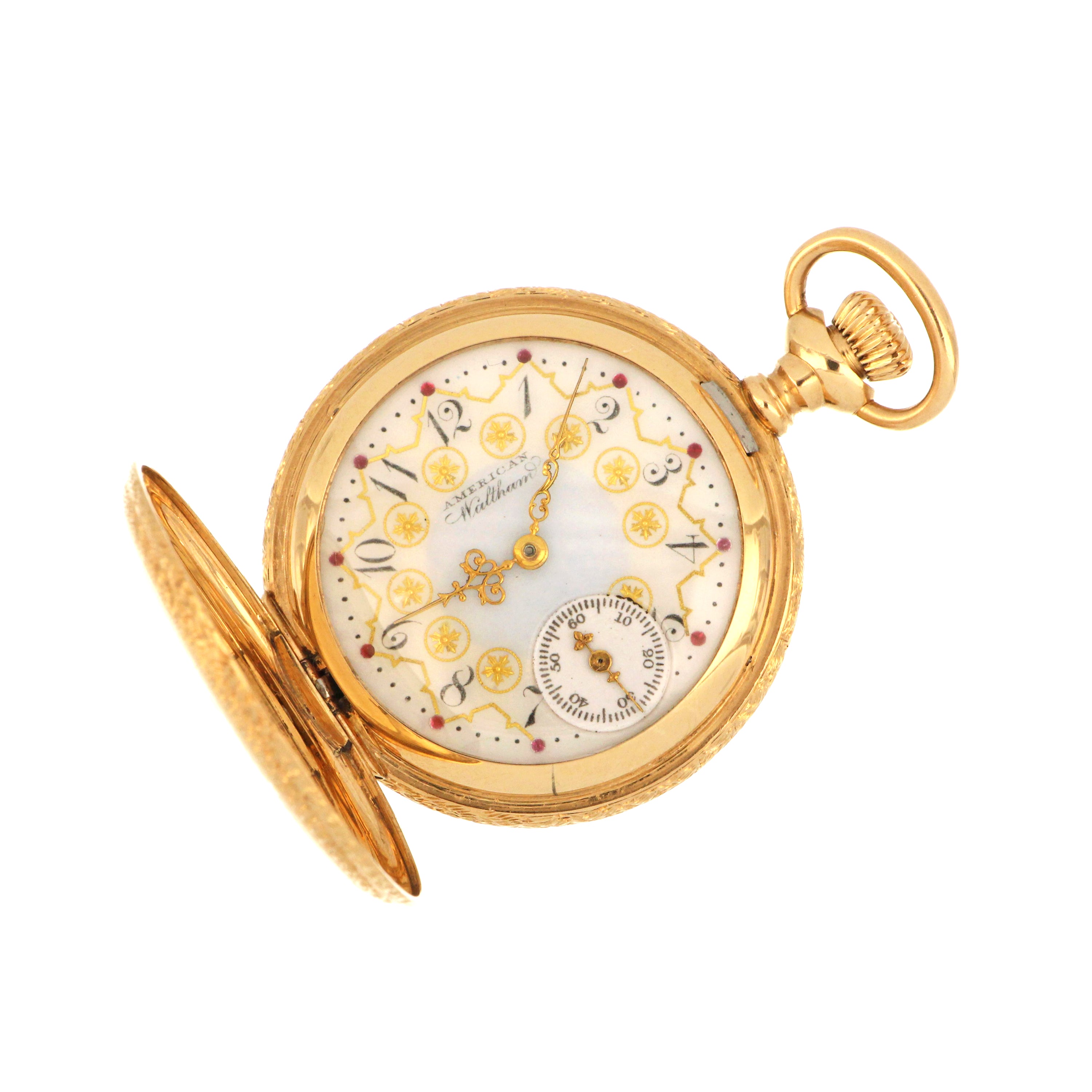 Waltham pocket watch, original 14kt yellow gold hunter case, white color porcelain dial with sub dial at 6 o'clock, movement# 6928453, on the back case: 553700, engraved inside the case. The total weight of this pocket watch is 36.31 grams.