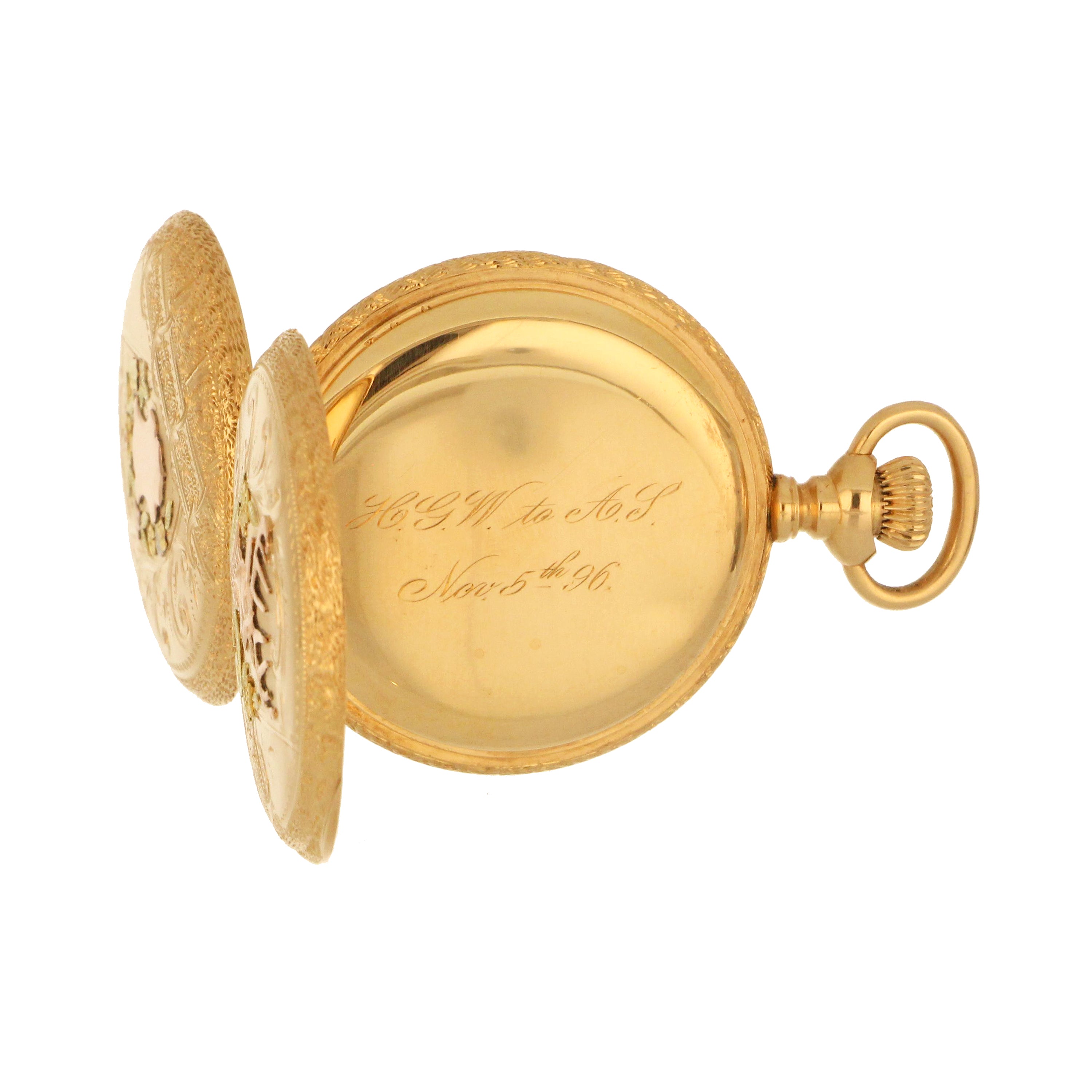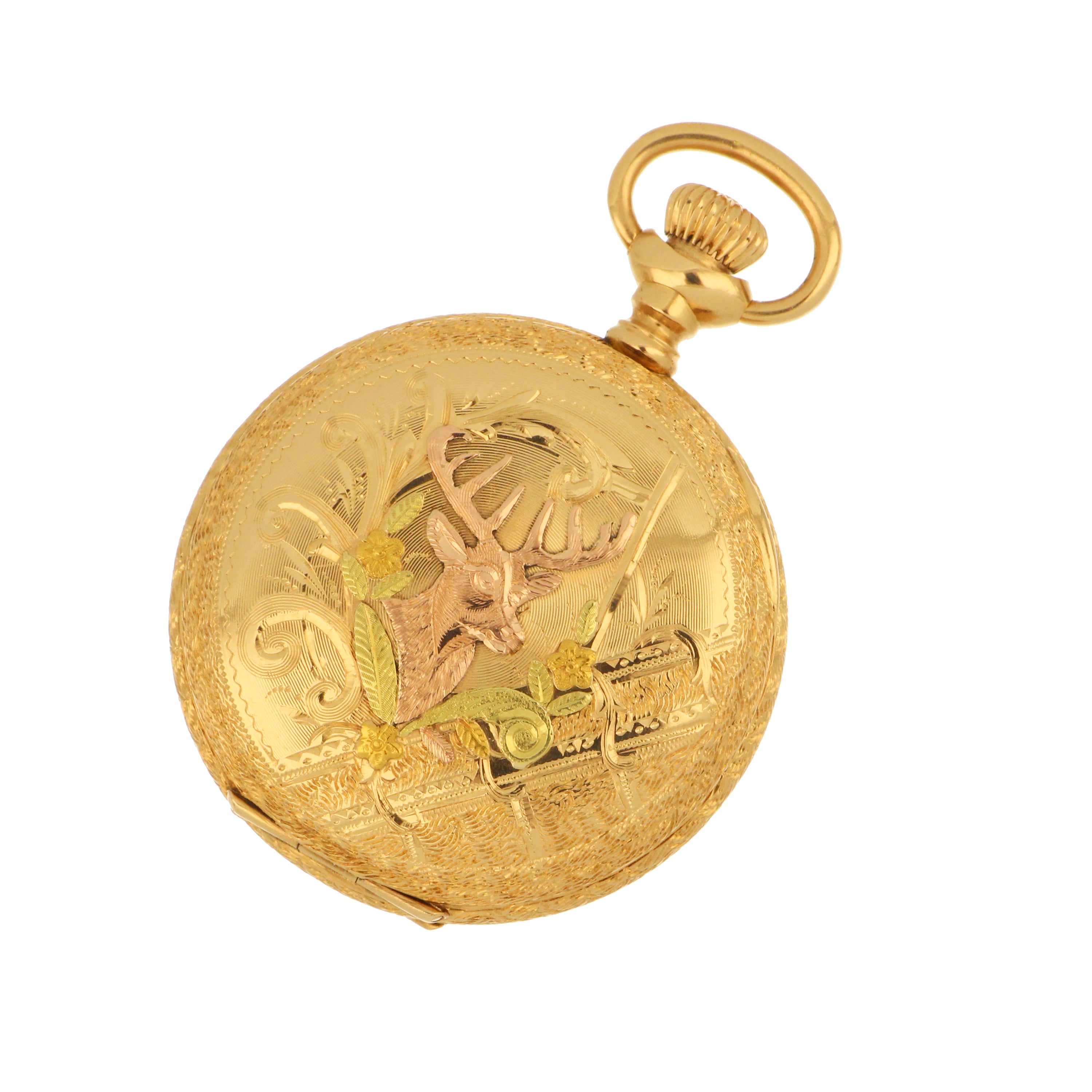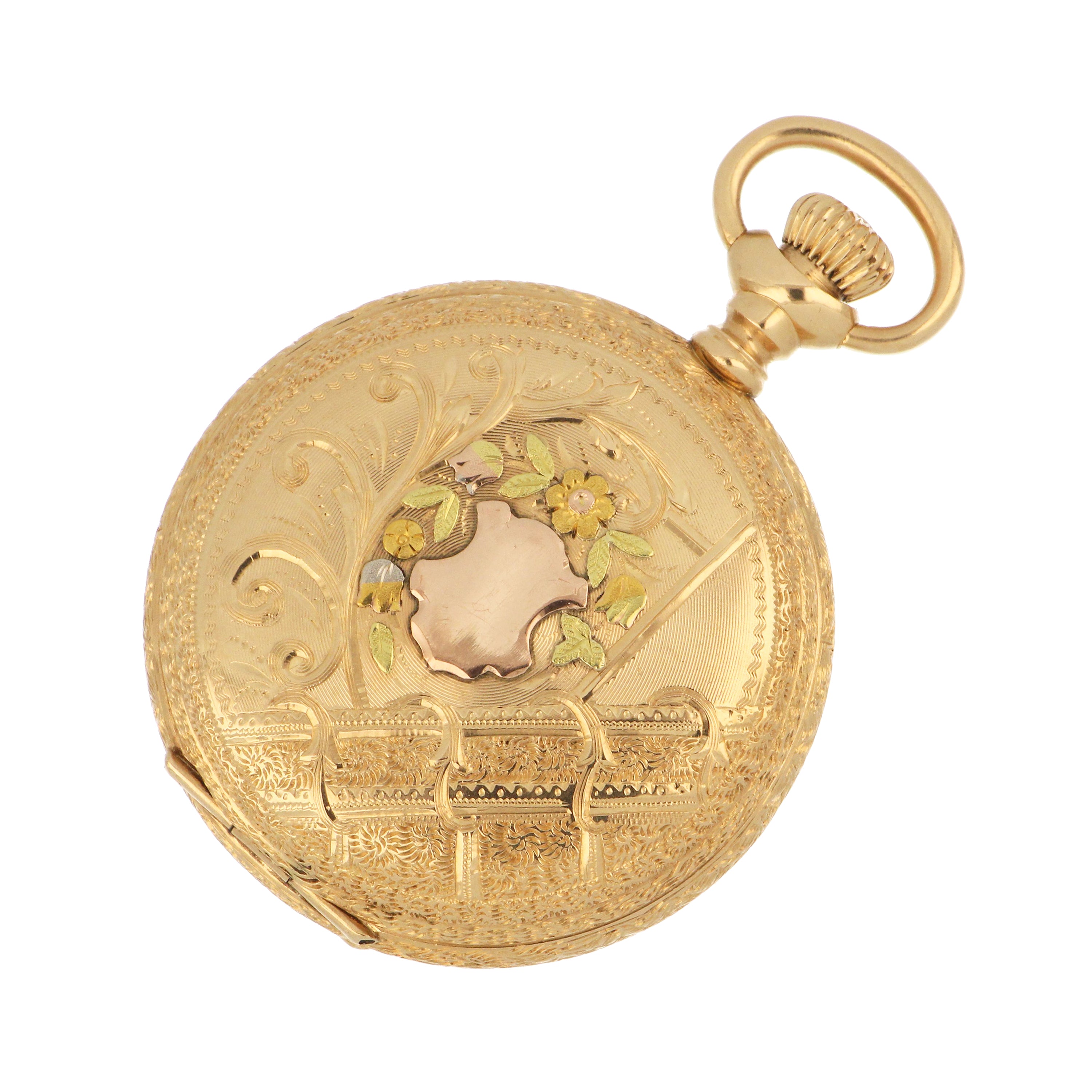 Waltham pocket watch, original 14kt yellow gold hunter case, white color porcelain dial with sub dial at 6 o'clock, movement# 6928453, on the back case: 553700, engraved inside the case. The total weight of this pocket watch is 36.31 grams.