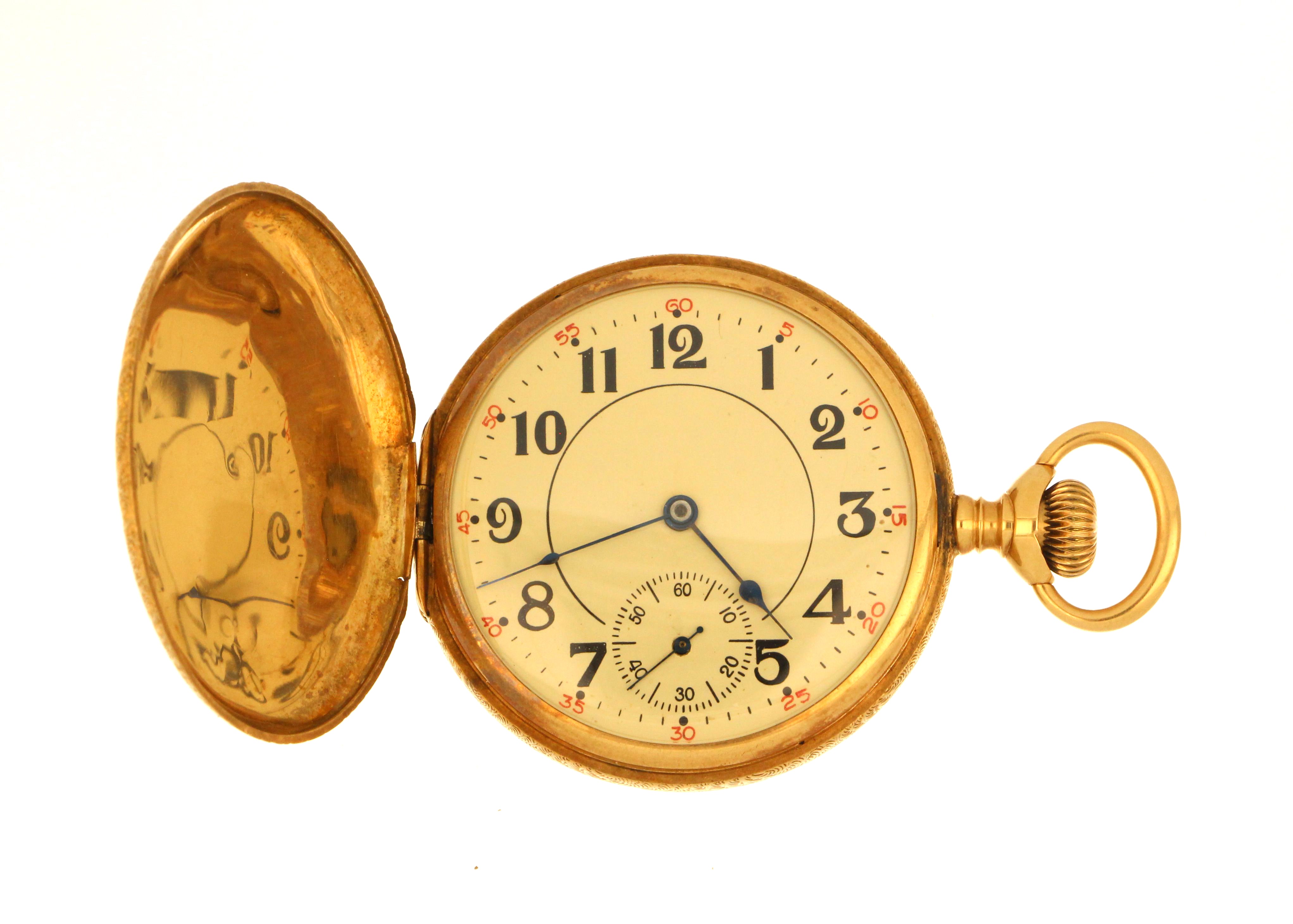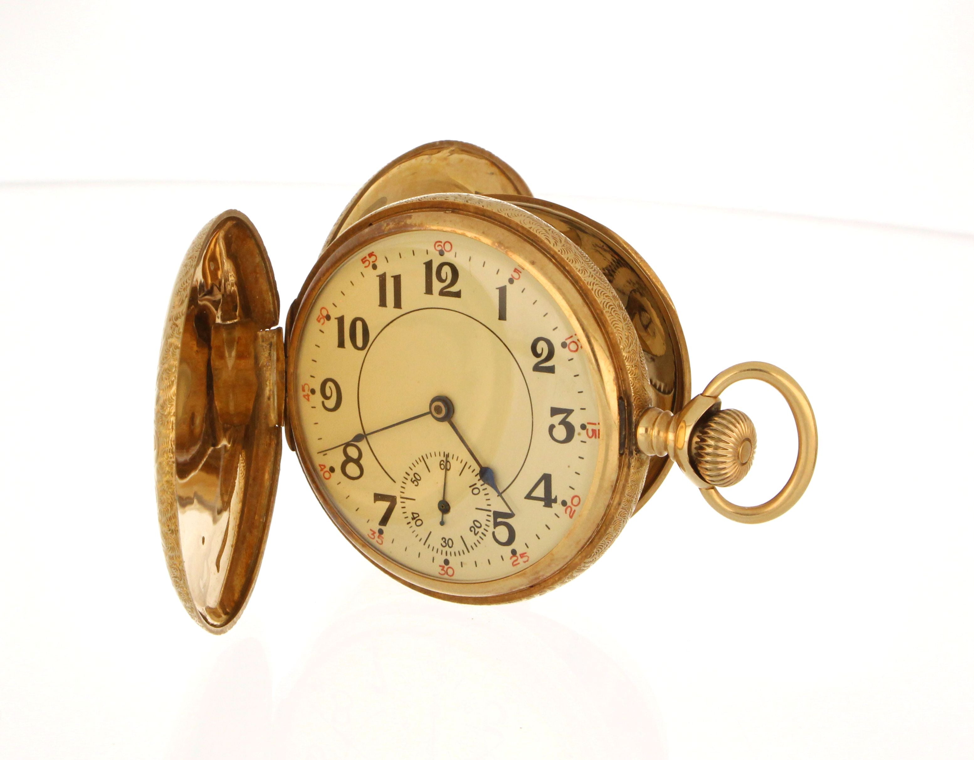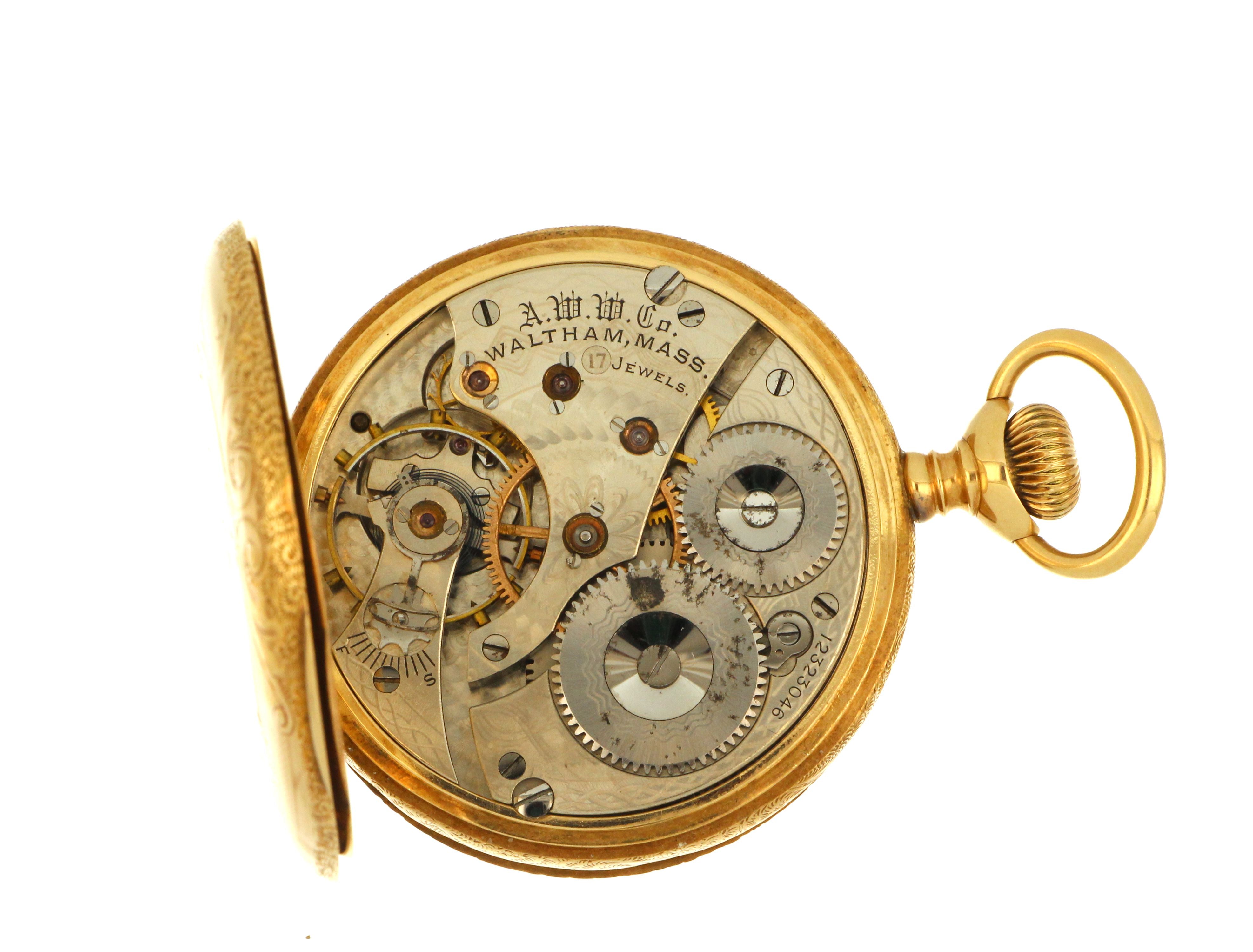 Waltham pocket watch, original 14kt yellow gold hunter case, sub dial at 6 o'clock, movement# 12323046, 17 jewels, on the back case: 399995. The total weight of this pocket watch is 86.90 grams.