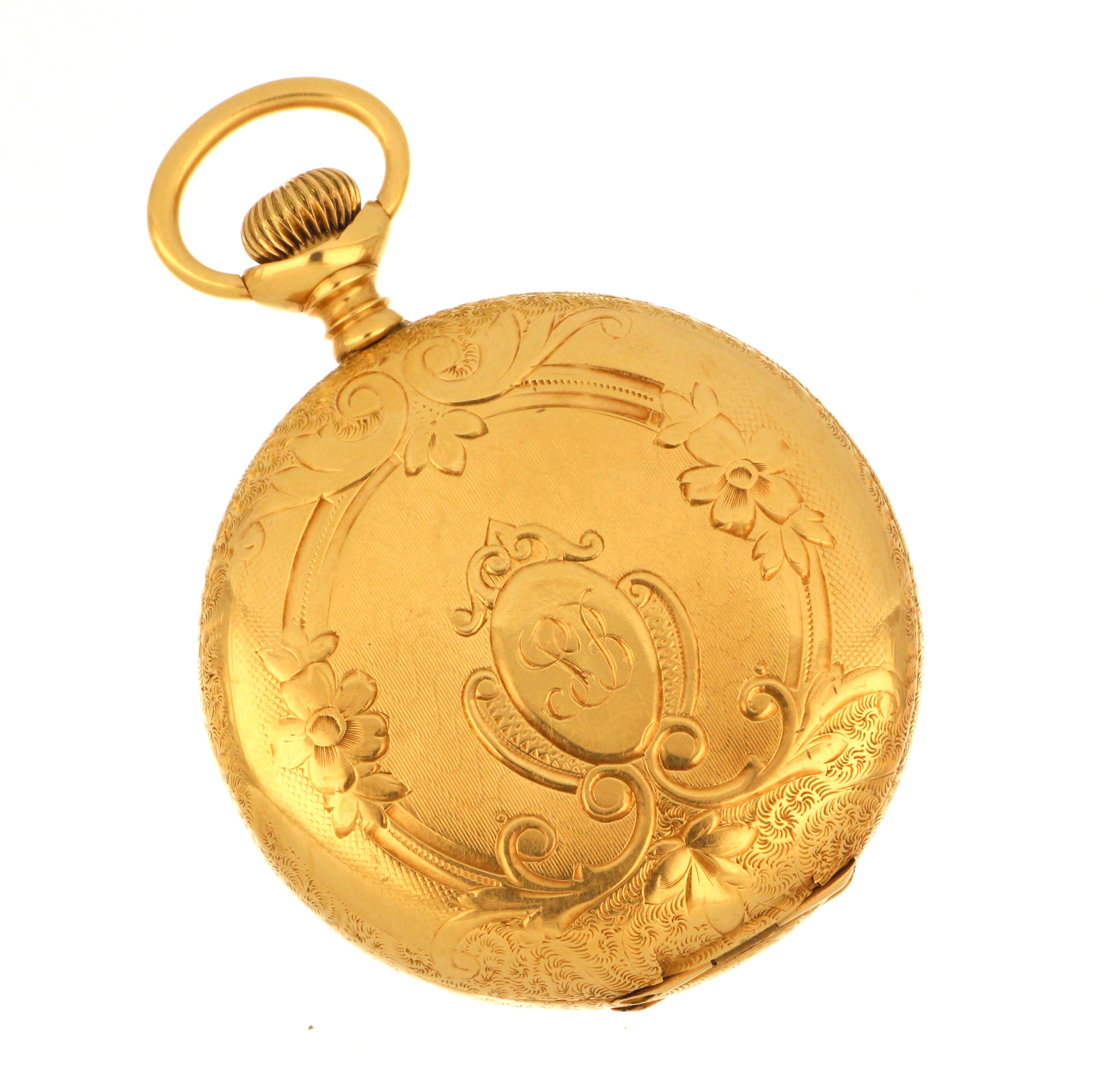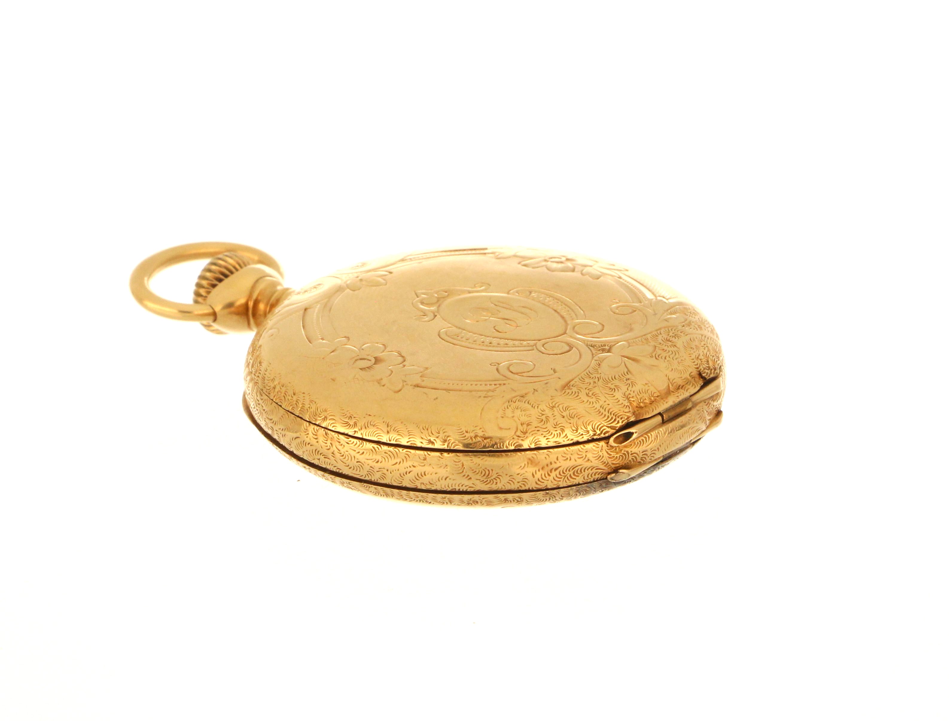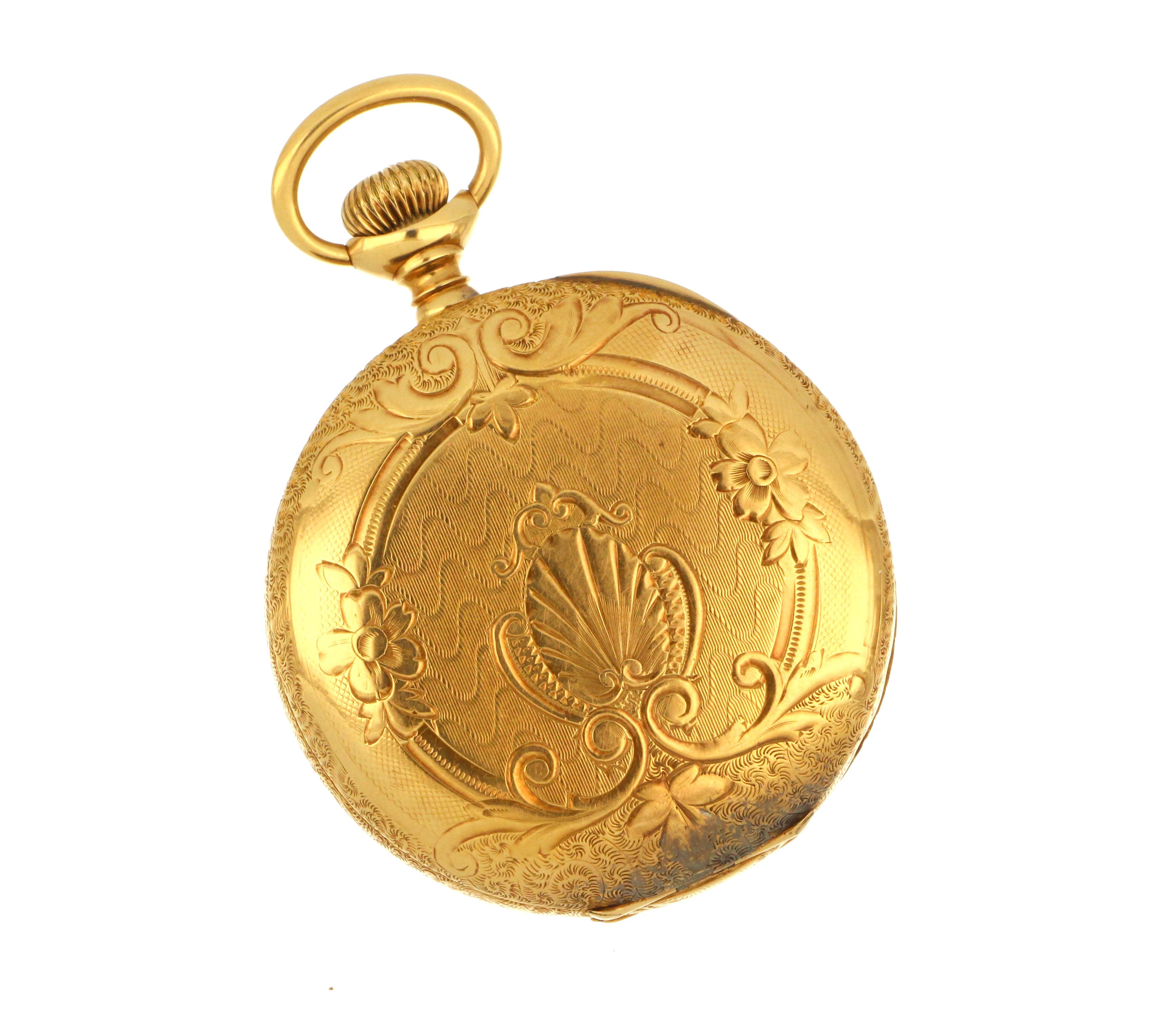 Waltham pocket watch, original 14kt yellow gold hunter case, sub dial at 6 o'clock, movement# 12323046, 17 jewels, on the back case: 399995. The total weight of this pocket watch is 86.90 grams.