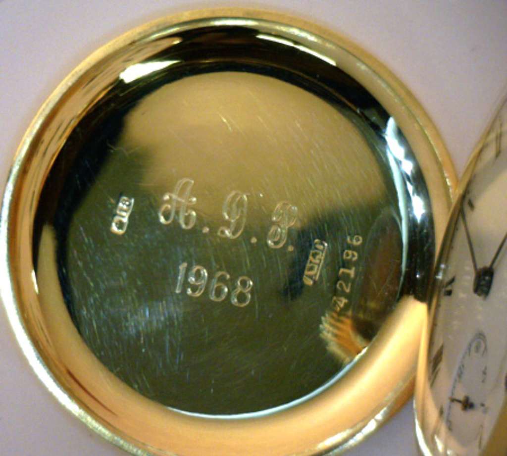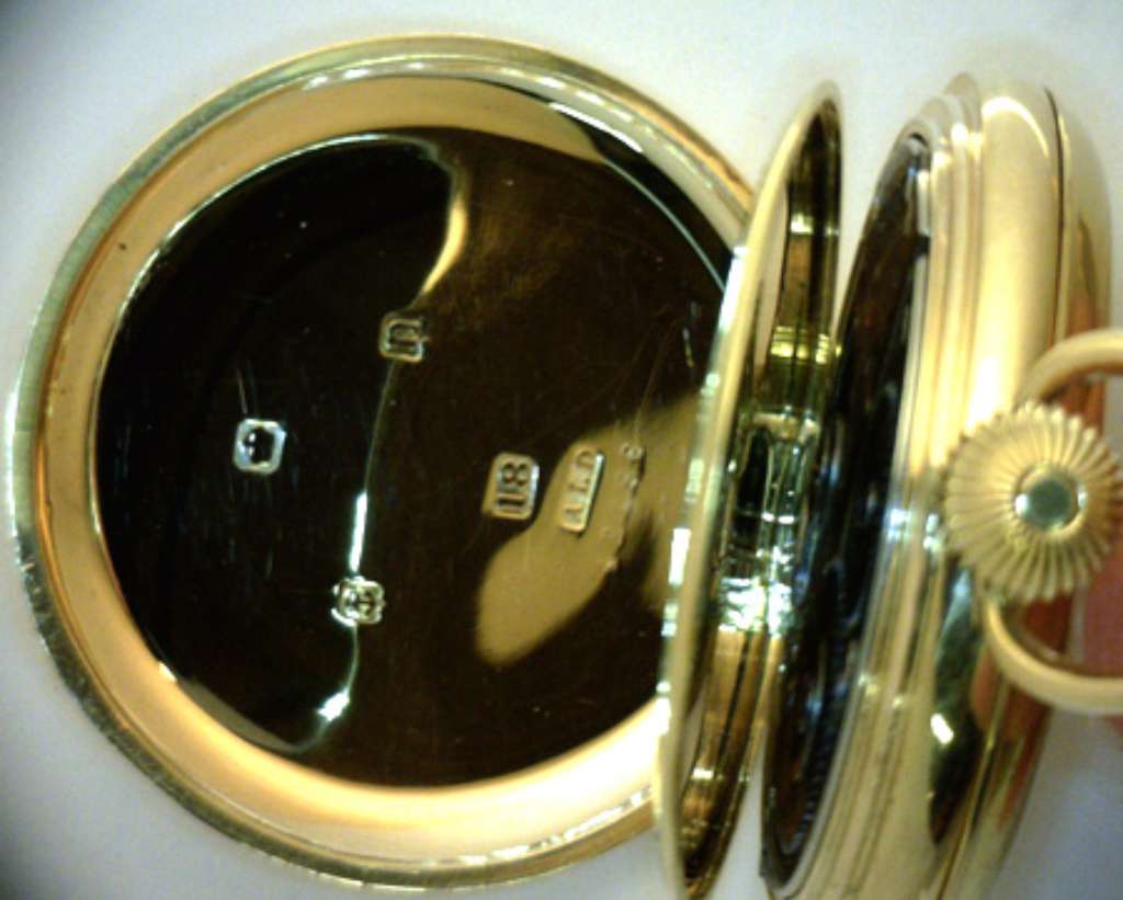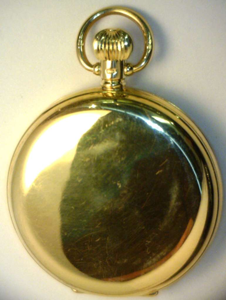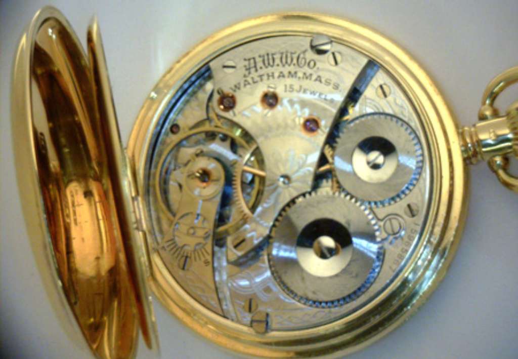 Waltham pocket watch, original 18kt yellow gold, hunting case, manual wind movement, 15 jewels, porcelain dial, 16 size, on the case: 42196, on the movement: 15965867, circa: 1940's, 103.38 grams.