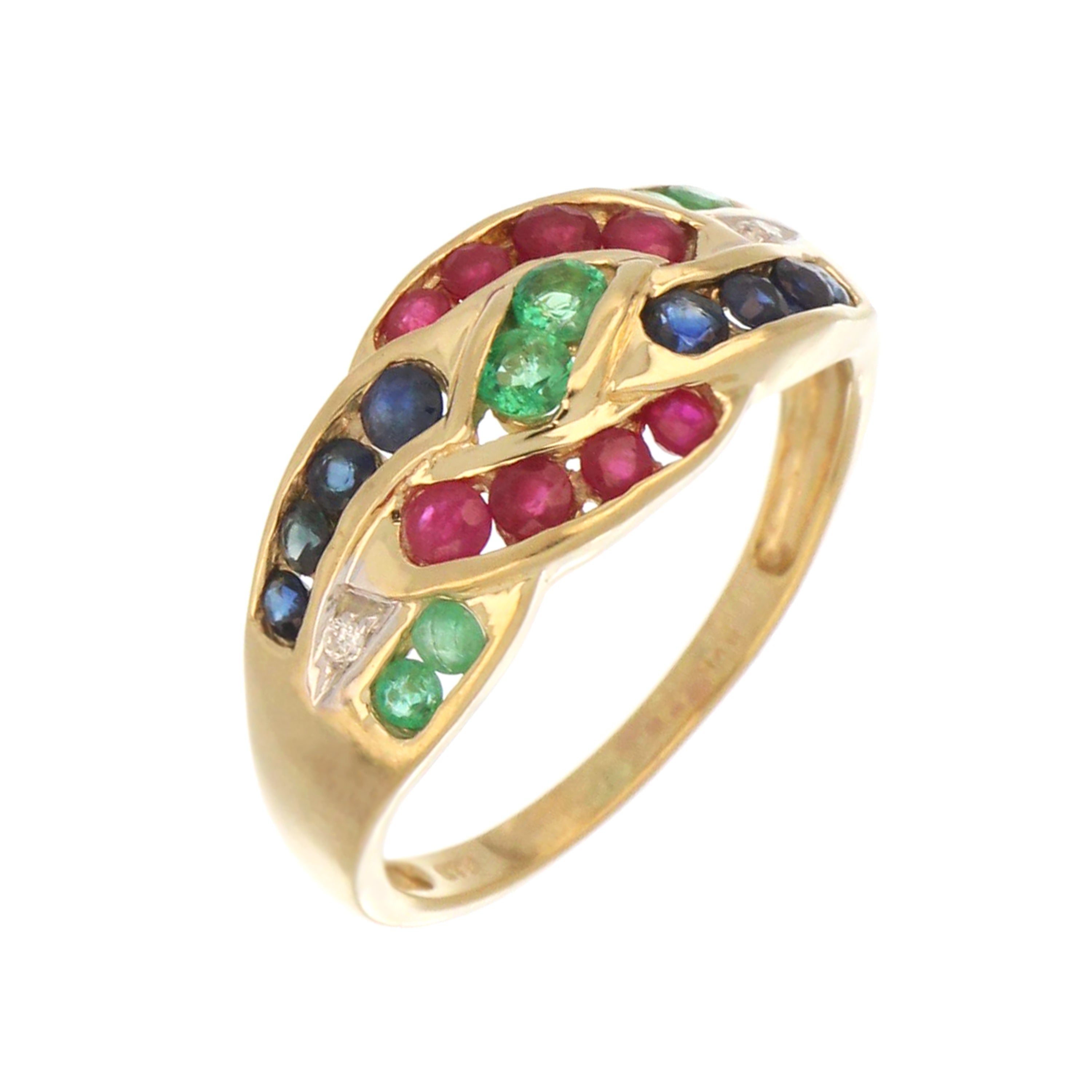 Vibrant and elegant, this 18kt yellow gold ruby and diamond band showcases timeless craftsmanship with rich red rubies and sparkling diamond accents—an exquisite pre-owned treasure.