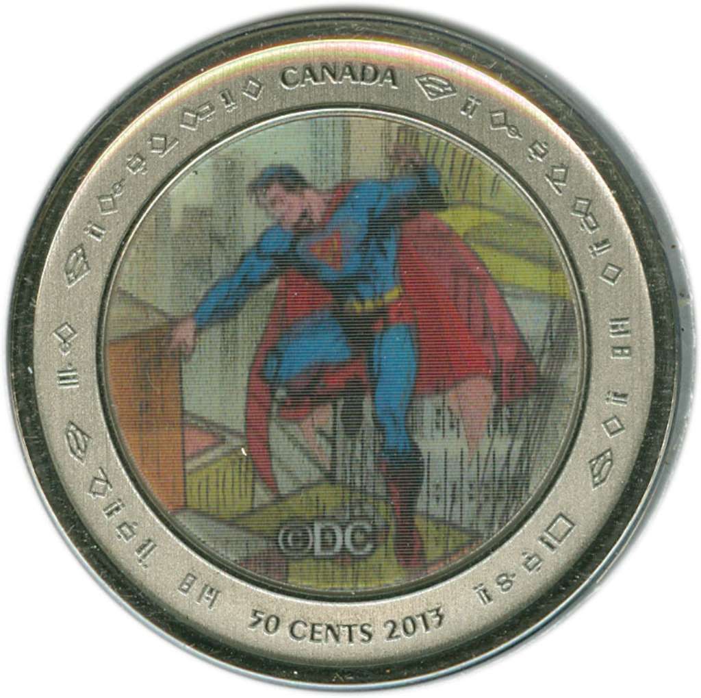 This 50-cent cupronickel coin has a diameter of 35 millimetres, and features a laser-created lenticular reverse image. The reverse image, created by DC Comics/Warner Brothers, features an ode to Superman's 75 years in publication. The reverse is engraved with the word "CANADA," the date "2013," and the face value of "50 CENTS," as well as "SUPERMAN" in the fictitious Kryptonian language from Superman's home planet in English and French. The obverse features the effigy of Her Majesty Queen Elizabeth II by Susanna Blunt.