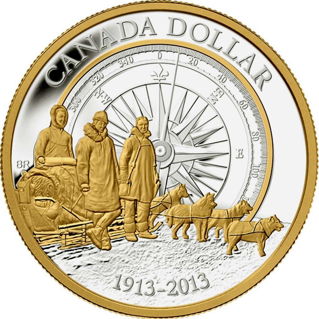 This Proof Silver Dollar is certified to be 99.99% pure silver with a diameter of 36.07 millimetres and a weight of 23.17 grams. Designed by Canadian artist Bonnie Ross, the reverse image portrays several significant elements from the Canadian Arctic Expedition. In the foreground, the image draws on the abundant photography from the Expedition to present a portrait of three men standing beside a dogsled packed with gear. Harnessed to the sled, the waiting dog team is watches and listens for the command to move on across the Arctic tundra. Above the mountainous skyline on the distant horizon, a stylized image of a compass pointed 10 degrees east of true North fills the background. The reverse features the words "CANADA DOLLAR" and the dates "1913-2013" to commemorate the 100th anniversary of the Canadian Arctic Expedition. The obverse features the effigy of Her Majesty Queen Elizabeth II by Susanna Blunt.