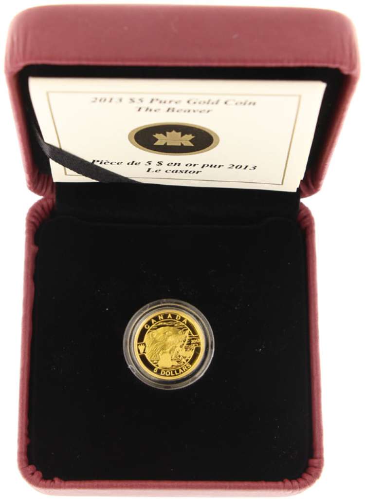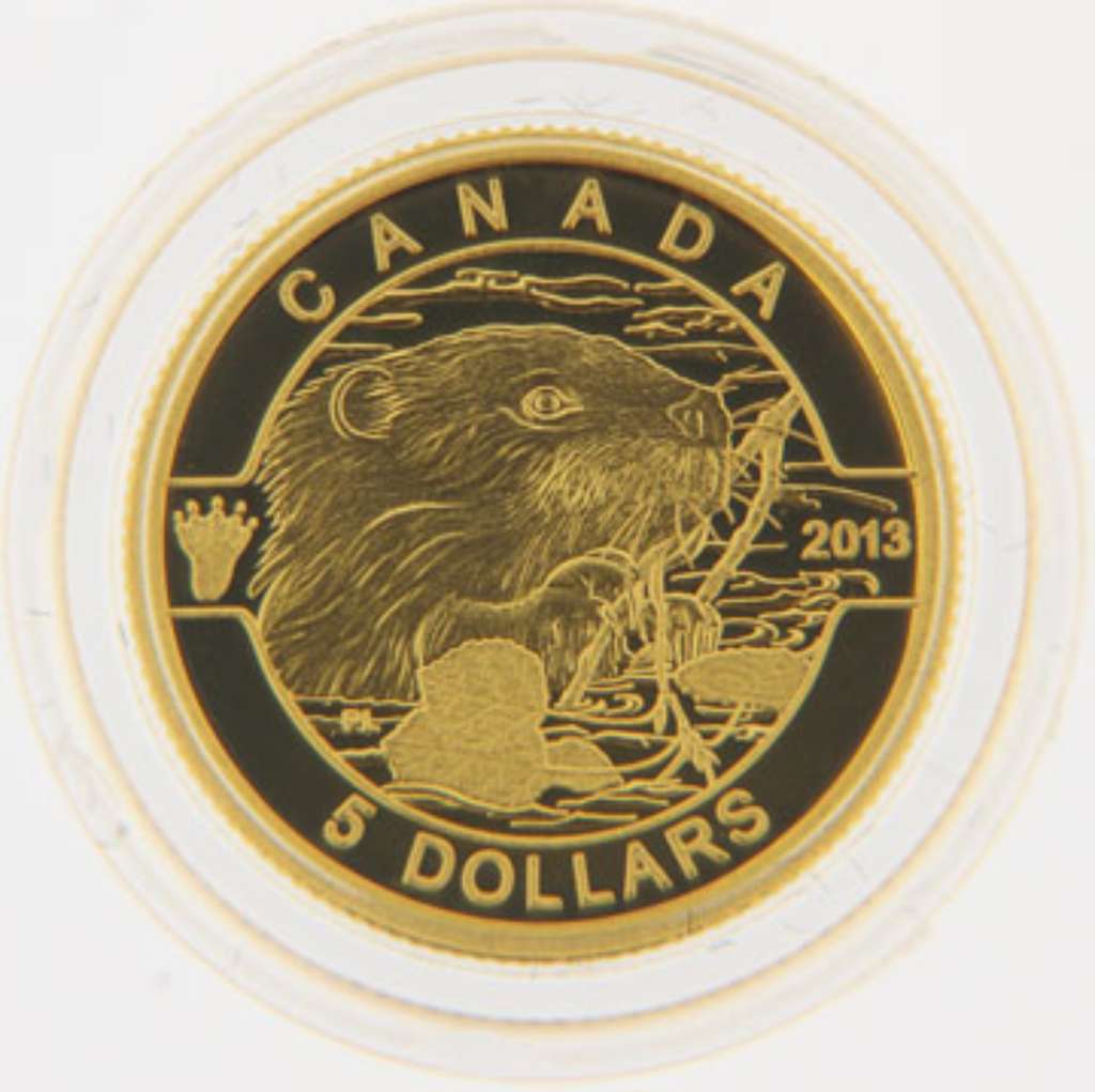 Your coin was designed by Canadian artist Pierre Leduc and features a detailed portrait of a beaver. Viewed in profile from its right side, the beaver's face fills the central field. The animal's distinctive small ears, eyes, and nose-all adapted for underwater living-rise above the water in which the beaver is partially immersed. The animal's mat of thick, well-groomed fur and whiskers are rendered in fine detail. Its clawed forepaws limberly clutch a small branch from a tree, which the beaver eagerly chews for sustenance. Framing the reverse imageis an outer band featuring the word "CANADA," the date "2013," and the facevalue of "5 DOLLARS," as well as a small stylized beaver paw print symbol.