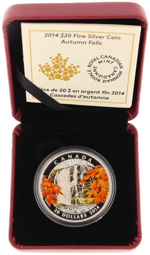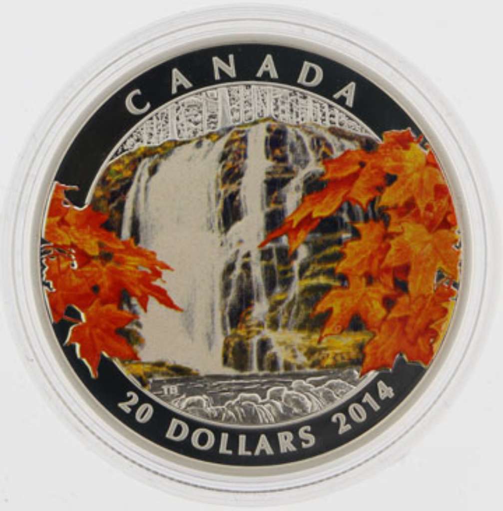 The reverse image by Canadian artist Tony Bianco features a striking autumn scene in a Canadian forest. In the foreground, clusters of golden-orange sugar maple leaves frame the right and left sides of the composition. In the background, a fast-rushing tiered waterfall-engraved directly into the silver-cascades down a sloping grey rock face carpeted in greenmoss and fallen maple leaves. The waterfall leads to an engraved silver brook rushing over a rock-strewn riverbed. At the top of the rock face, the tall tree trunks of a deciduous forest are lent mystical beauty through engraving that evokes the sun's rays falling through a forest still densely canopied in early autumn. The design uses a combination of colour, the silver coin surface and engravingto create a homogenous and painterly image.