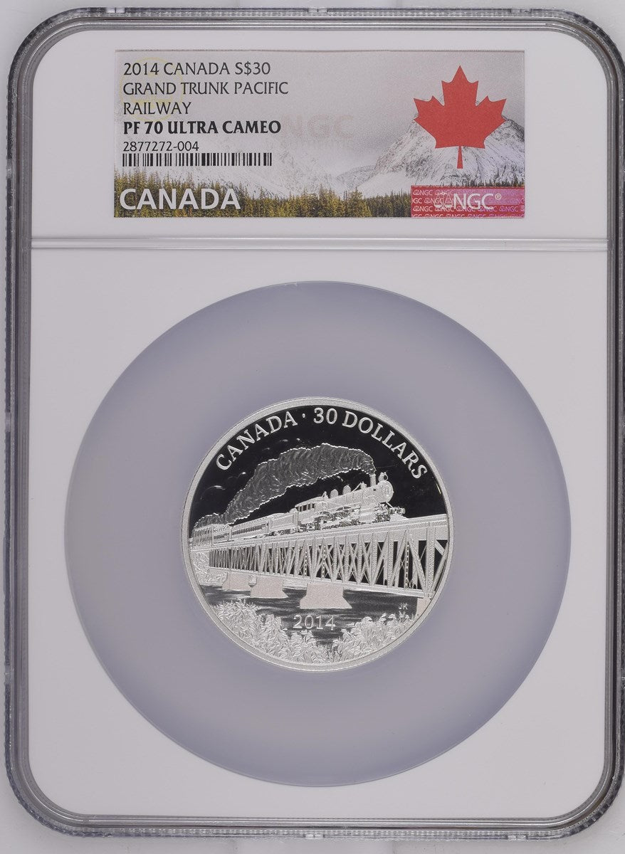A century ago, the transcontinental railway enabled the settlement of western Canada. The Royal Canadian Mint commemorates the 100th anniversary of the completion of the Grand Trunk Pacific Railway-a massive early twentieth-century engineering feat that linkedeastern Canada to the Pacific-with this rare 2-ounce 99.99% pure silver coin.