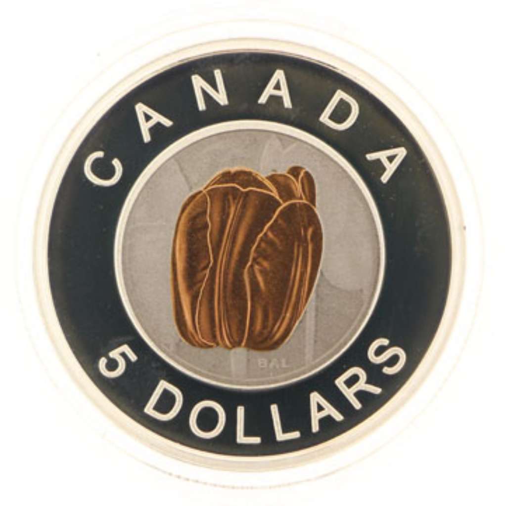 This coin shows a single tulip flower selectively coloured so it stands out from a sea of blooms-a tribute to the welcome sight that graces Canadian gardens from coast to coast each spring. The design is furtherenhanced by the coin's oxidized niobium core to create a stunning, one-of-a-kind effect.