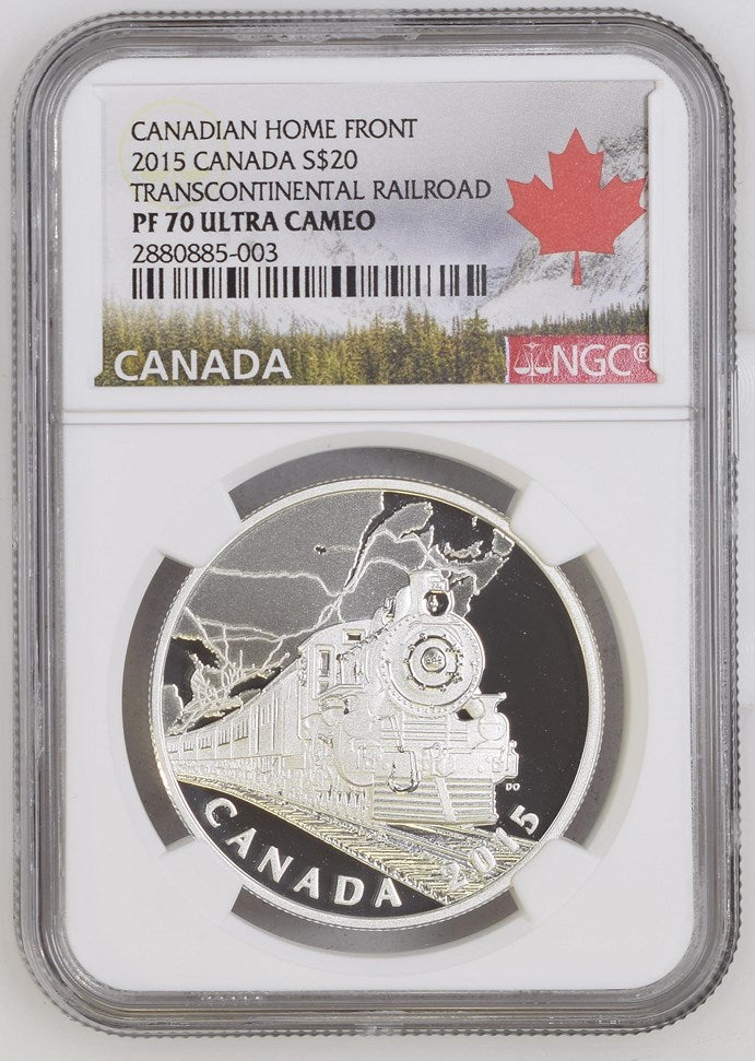 The first coin in your Canadian Home Front 4-coin subscription is the Transcontinental Railroad, which highlightsthe war effort on the Canadian home front across the country. This fine silver coin proudly commemorates the important role played by Canada's railway systems during the First World War. Exceptionally detailed engraving and beautiful finishes come together in this intricate design that features a 4-6-2 "Pacific" steam locomotive pulling passenger cars filled with Canadian soldiers.