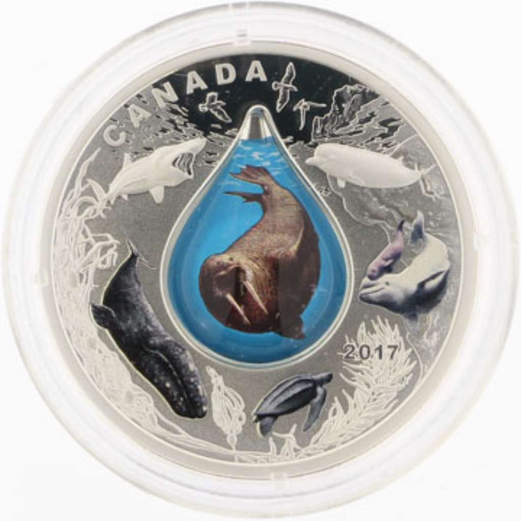 Dive into Canada's oceans with this stunning coin that takes you beneath the waves to discover the amazing underwater worlds that lie off Canada's east, west and Arctic coasts. Meet the walrus swimming within the unique 3D water droplet and the diverse ocean residents who face significant challenges brought on by human activity.