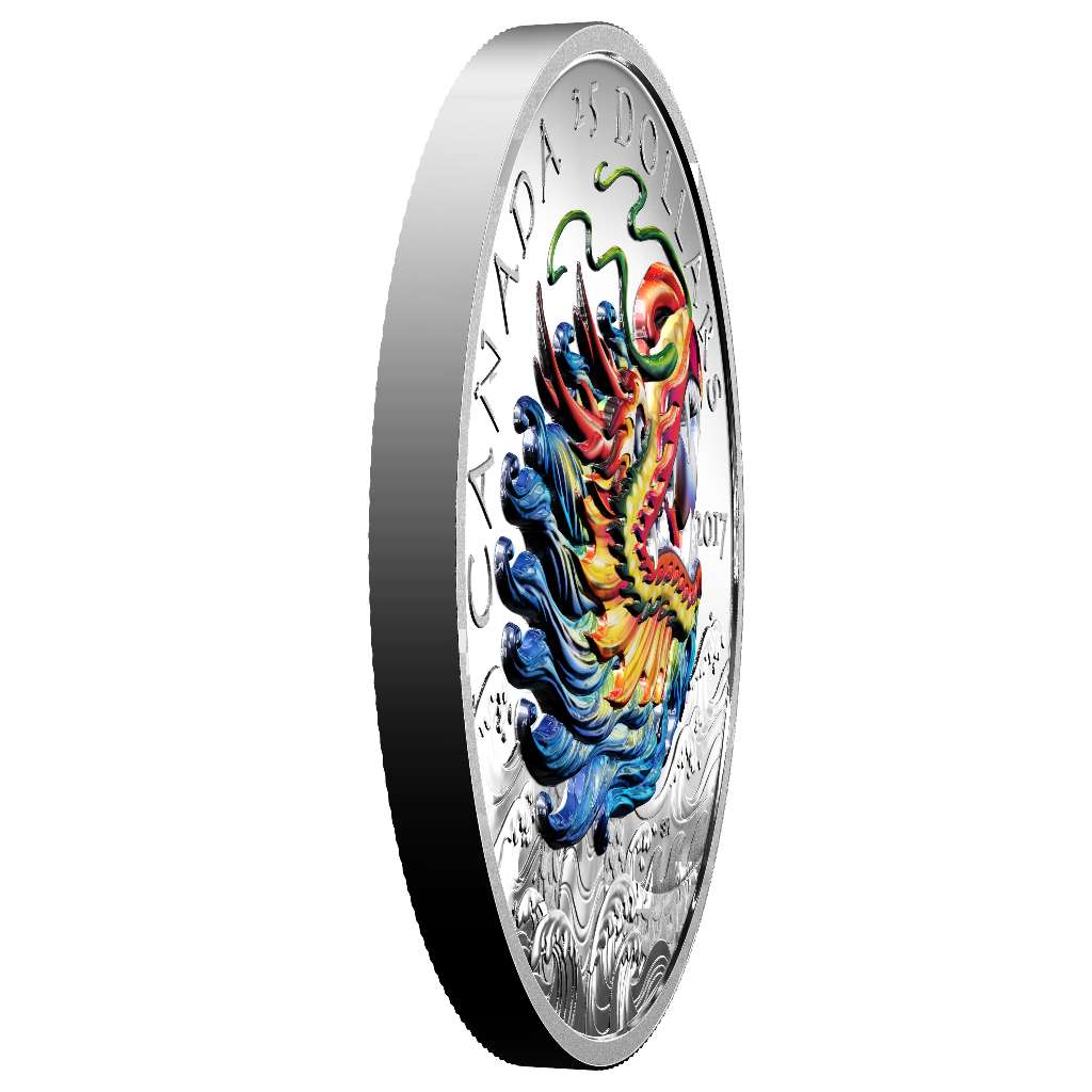 Designed by Canadian artist Simon Ng, your coin offers an artistic tribute to Dragon Boat Festival through the skilful fusion of ancient symbolism, traditional art elements and modern minting techniques. The lower portion of the coin is dominated by foam-tipped waves-an auspicious pattern that also adds a sense of motion to the design. In fact,curved lines are present throughout this water-themed design, including the dragon's mane that evokes the sensation of wind and movement. Engraved in ultra-high relief for added depth and dimension, the serpentine spirit emerges from the water in a way that mimics the shape of a dragon boat, with its neck curved like a boat's gunwale. The dragon's features are resplendent in colourful hues ofred, gold, green and blue, culminating in the blue pearl held tight in its jaw as a symbol of wisdom, and the active yang aspect of qi-the lifeforce that surrounds us.