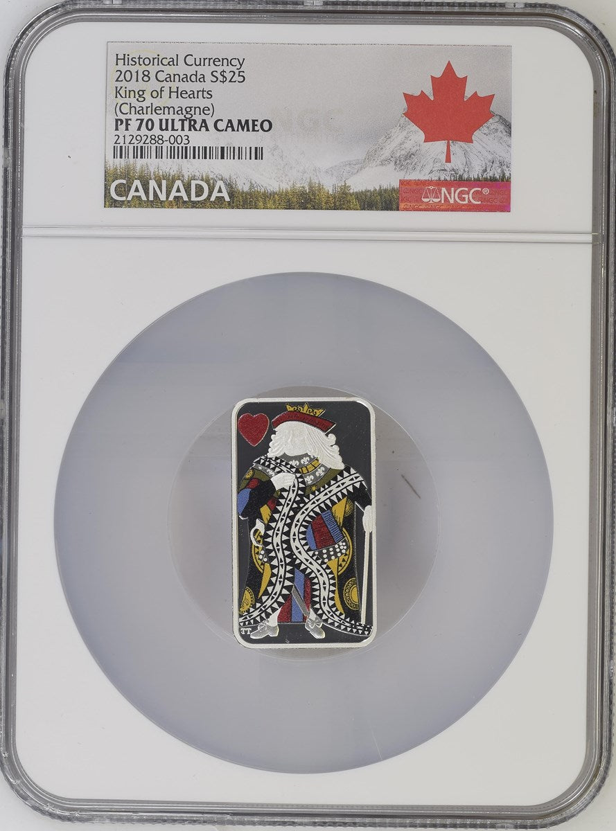 Beaver pelts, strings of beads, and wheat have all been used as legal tender in Canada's early history-but so too have playing cards. Introduced in 1685, the playing card money of New France is one of the most interesting chapters in the story of Canadian currency. The colourful cards bore hand-written values on the back, and could be redeemed once the next shipment of French coins arrived. They were only intended to be a temporary fix; instead, card money was re-issued and circulated like modern-day banknotes until 1759. Masterfullyengraved and colourized, your four-coin collectible reaches into history to bring an unusual form of currency right to your fingertips. Few examples of the original card money have survived, but this set gives you the next best thing: four of a kind, a King of each suit, all preserved in pure silver and illustrated in a full colour style reminiscent of 18th-century court cards.