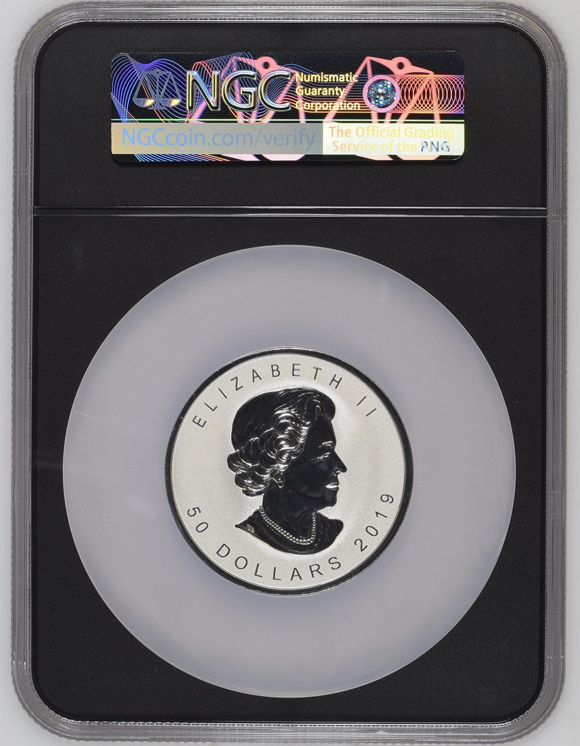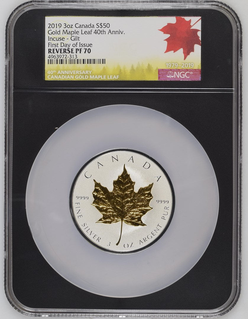 Your coin features Walter Ott's iconic maple leaf design from the original Gold Maple Leaf bullion coin released in 1979. The realistic sugar maple leaf is incuse-struck into the surface of the coin. The reverse features the words "CANADA" and "FINE SILVER 3 OZ ARGENT PUR" as well as the purity standard of "9999". The obverse features the effigy of Her Majesty Queen Elizabeth II by Susanna Blunt. Her Majesty'simage is incuse-struck. The obverse features the date "2019" and the face value of "50 DOLLARS." The coin also bears commemorative edge lettering with the number "40" flanked on both sides by a mapleleaf, and selective gold plating on the iconic maple leaf.