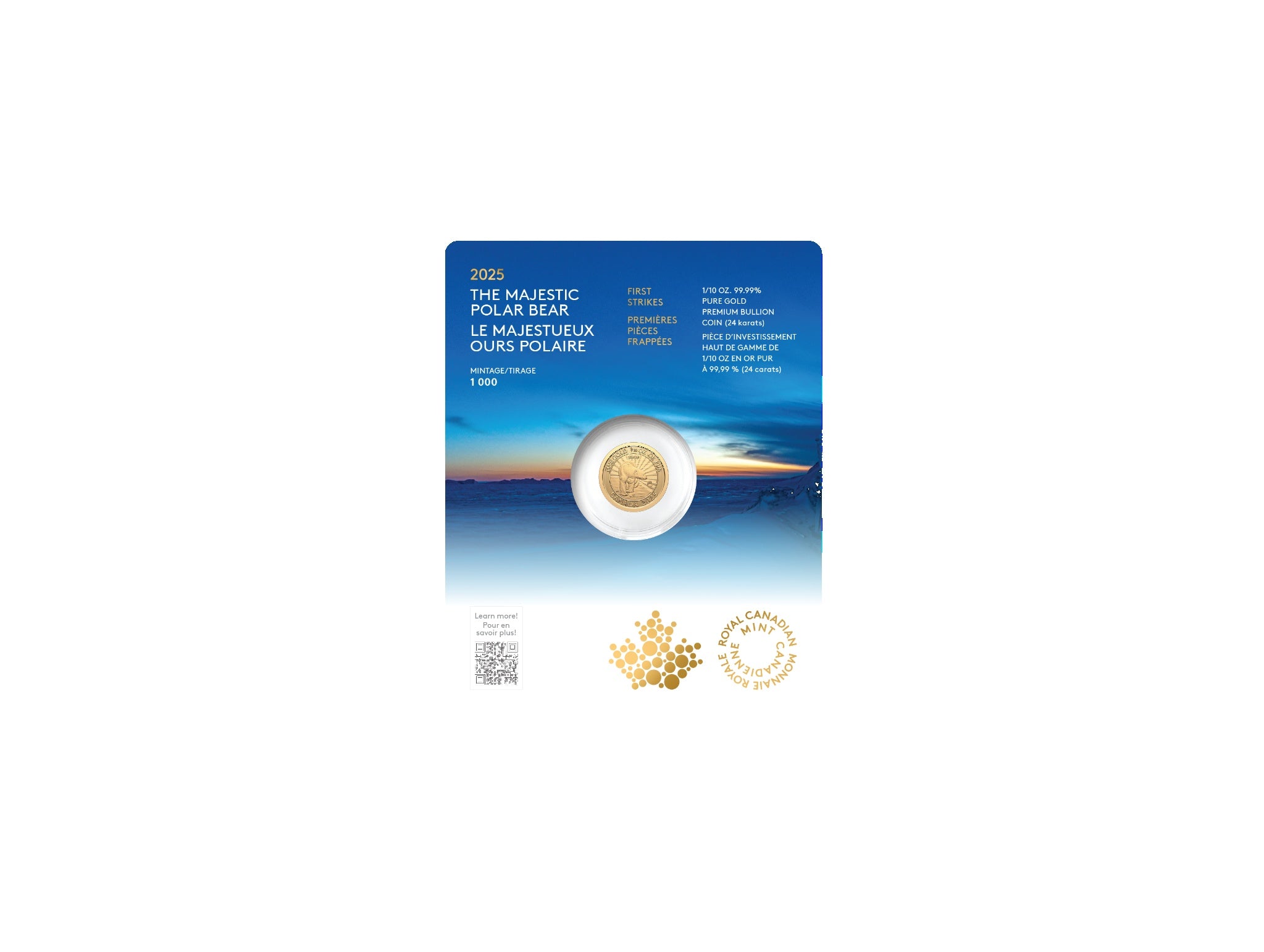 Discover the exquisite Canada 2025 $5 First Strikes gold coin, featuring the captivating motif of majestic polar bears rendered in 99.99% pure gold. Weighing a precise 0.1 ounces, this authentic collectible coin boasts a brilliant sunburst finish enhanced by vivid radial lines, lending dynamic energy and movement to the engraved scene. Each coin is a limited edition with a guaranteed minimum weight, crafted with exceptional care during the minting process.