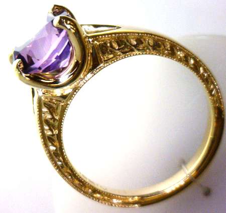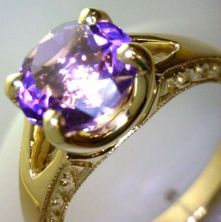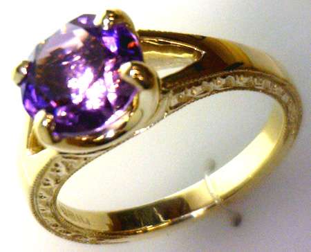 Custom-made 14kt yellow gold engagement ring sets with a round faceted amethyst in "U" shape and 4-claw setting, highly polished shank on the top facet with leaf patters on the both sides. ( Call for price quotation depending on the type of metal, karat, quality and quantity of gemstones, etc. and whether or not you supply your own metal or gemstones. ) Product Code#: CUSTOM RING 21 Metal: 10k, 14k, 18k, 19k, Platinum Color: white, yellow, rose Stone: diamond, gem stone Price: depends on metal and stone, etc.