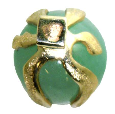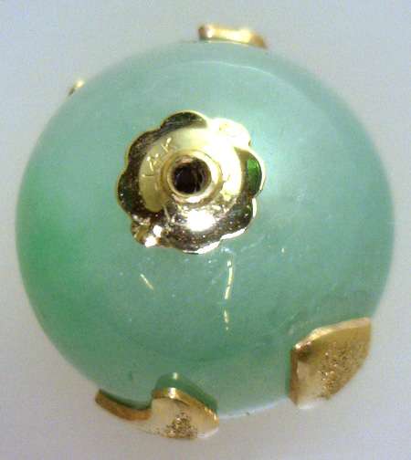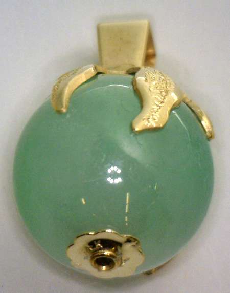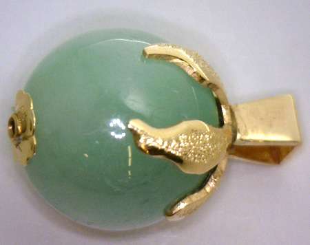 Custom made Jade bead pendant, 14kt yellow gold custom-made bail, sets with a jade bead. (This design is able to cover some cracks and this prevents the stone falling apart.) ( Call for price quotation depending on the type of metal, karat, quality and quantity of gemstones, etc. and whether or not you supply your own metal or gemstones. ) Product Code#: CUSTOM PENDANT 1 Metal: 10k, 14k, 18k, 19k, Platinum Color: white, yellow, rose Stone: diamond, gem stone Price: depends on metal and stone, etc.