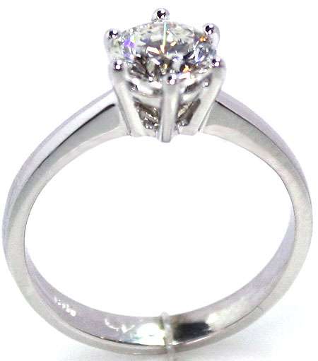 Custom-made 19kt white gold solitaire diamond ring, the round brilliant cut diamond set in 6-claw setting with highly polished shank. ( Call for price quotation depending on the type of metal, karat, quality and quantity of gemstones, etc. and whether or not you supply your own metal or gemstones. ) Product Code#: CUSTOM RING 20 Metal: 10k, 14k, 18k, 19k, Platinum Color: white, yellow, rose Stone: diamond, gem stone Price: depends on metal and stone, etc.