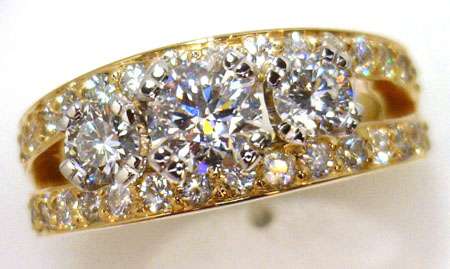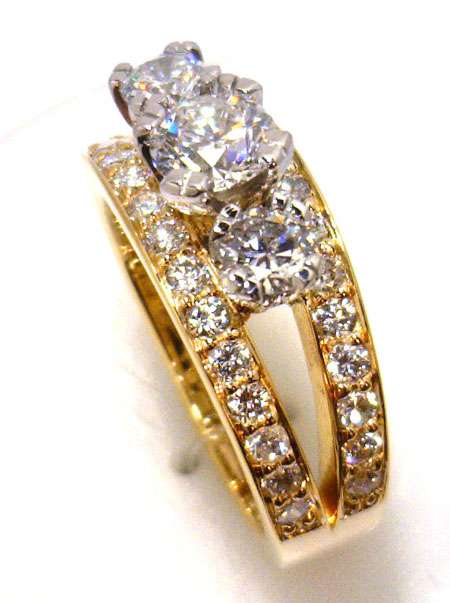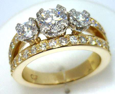 Custom made 18kt yellow gold diamond ring, the center round brilliant cut diamond estimated 1.02ct, 2 pieces of round brilliant cut diamonds estimated 0.65cttw, in VS2-SI1 clarity and G-H color. ( Call for price quotation depending on the type of metal, karat, quality and quantity of gemstones, etc. and whether or not you supply your own metal or gemstones. ) Product Code#: CUSTOM RING 3 Metal: 10k, 14k, 18k, 19k, Platinum Color: white, yellow, rose Stone: diamond, gem stone Price: depends on metal and stone, etc.