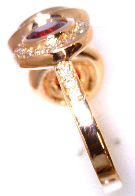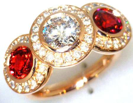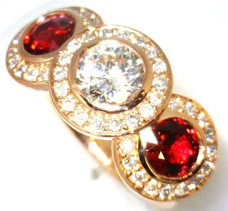 Custom made 18kt rose gold diamond and ruby ring, the center round brilliant cut diamond estimated weight 1.04ct (6.38-3.45 x 3.95mm), in SI3 clarity and H color; 2 pieces of rubies estimated weight 0.86cttw (5.51-5.51mm x 3.24mm), eye clean clarity and fine deep red color, origin from Mozambique; surrounded with total 66 pieces of full cut diamonds estimated weight 0.72cttw, in VS-SI clarity and F-I color, set in pave setting. The total weight of this ring is 9.88 grams. ( Call for price quotation depending on the type of metal, karat, quality and quantity of gemstones, etc. and whether or not you supply your own metal or gemstones. ) Product Code#: CUSTOM RING 2 Metal: 10k, 14k, 18k, 19k, Platinum Color: white, yellow, rose Stone: diamond, gem stone Price: depends on metal and stone, etc.