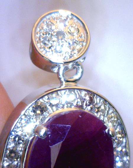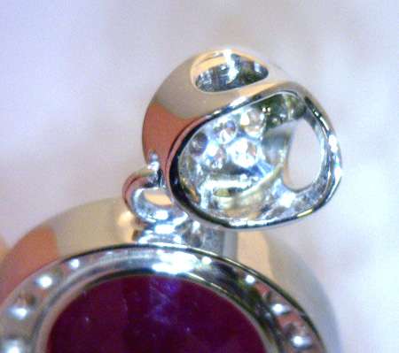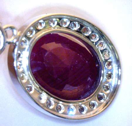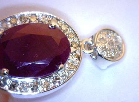 Custom made 14kt white gold ruby pendant, the center oval shaped over 6 carat ruby surrrounded with small round brilliant cut diamonds set in pave setting, and a flexible circle style bail on the top. ( Call for price quotation depending on the type of metal, karat, quality and quantity of gemstones, etc. and whether or not you supply your own metal or gemstones. ) Product Code#: CUSTOM PENDANT 2 Metal: 10k, 14k, 18k, 19k, Platinum Color: white, yellow, rose Stone: diamond, gem stone Price: depends on metal and stone, etc.