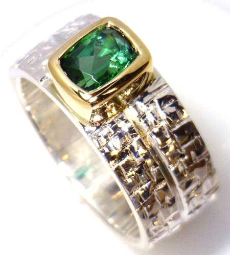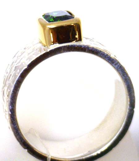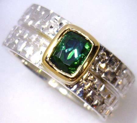 Custom-made sterling silver peridot ring, the center emerald cut peridot set in 14kt yellow gold full bezel setting. ( Call for price quotation depending on the type of metal, karat, quality and quantity of gemstones, etc. and whether or not you supply your own metal or gemstones. ) Product Code#: CUSTOM RING 6 Metal: 10k, 14k, 18k, 19k, Platinum Color: white, yellow, rose Stone: diamond, gem stone Price: depends on metal and stone, etc.