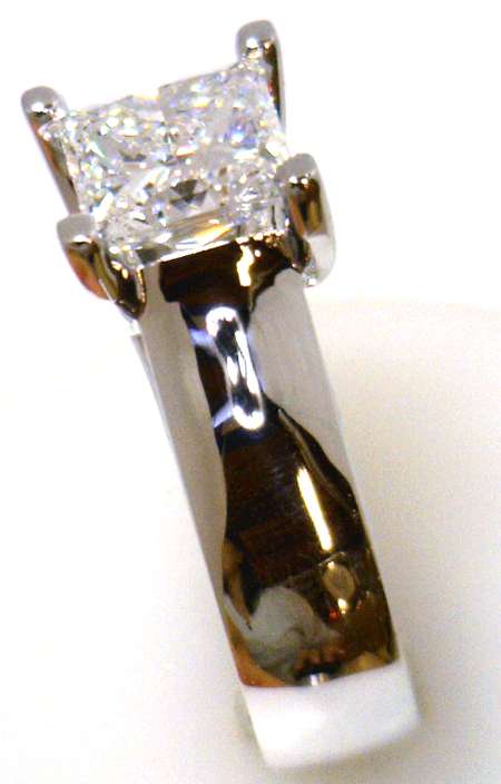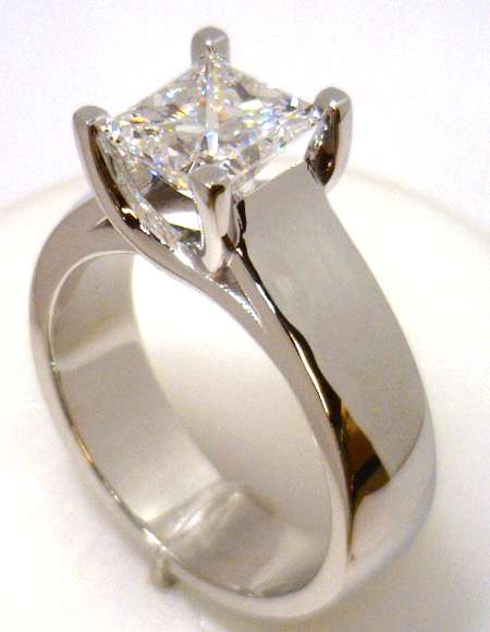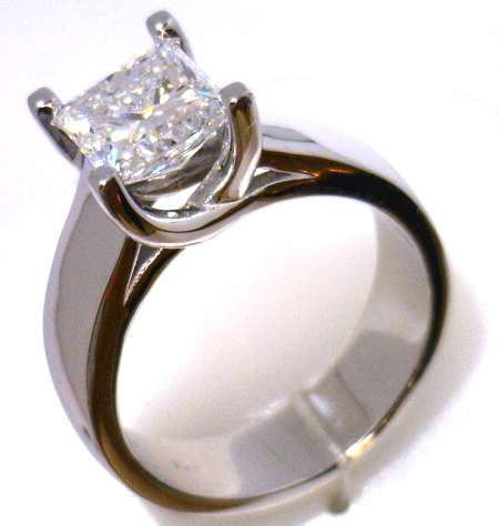 Custom-made 19kt white gold diamond ring, the center princess cut diamond estimated weight 1.53ct, set in 4-claw setting with highly polished shank. ( Call for price quotation depending on the type of metal, karat, quality and quantity of gemstones, etc. and whether or not you supply your own metal or gemstones. ) Product Code#: CUSTOM RING 11 Metal: 10k, 14k, 18k, 19k, Platinum Color: white, yellow, rose Stone: diamond, gem stone Price: depends on metal and stone, etc.