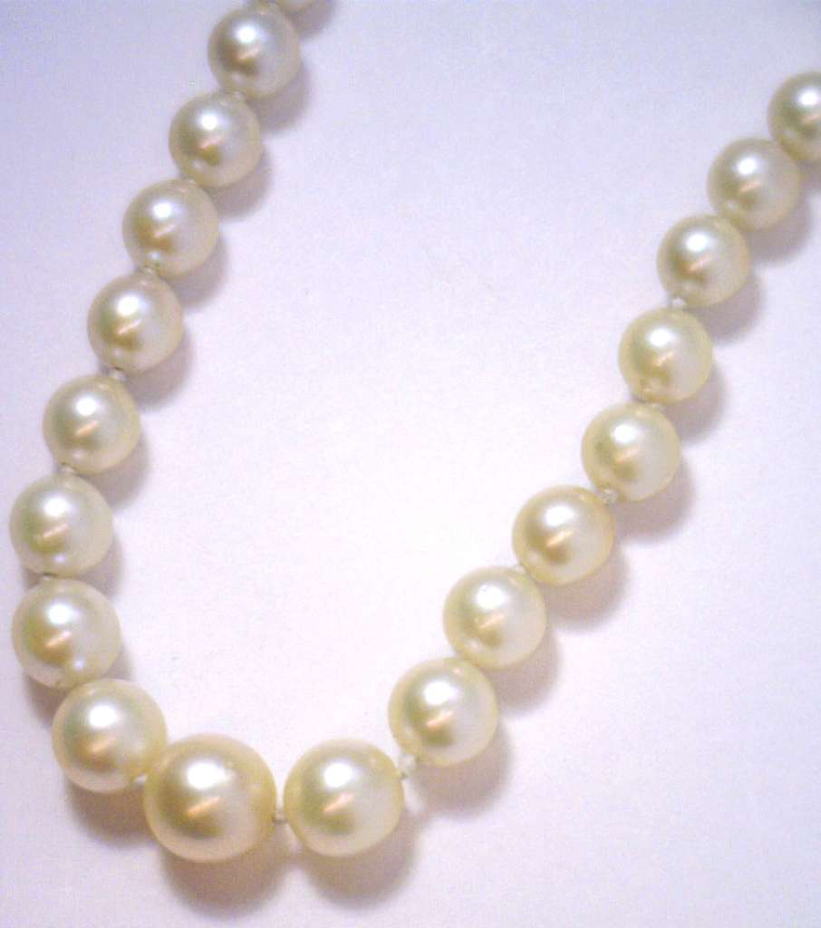 One string of graduated style pearl necklace, the white color pearls estimated 3.2-7.1mm for each, 19 inches in length, with a piece of 14kt yellow gold clasp.